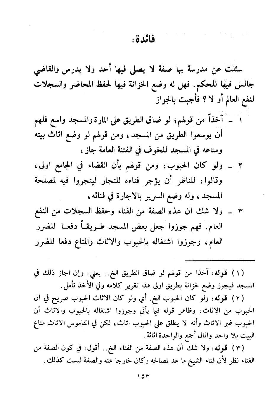 1 - آخِذًا مِنْ قَوْلِهِمْ؛ لَوْ ضَاقَ الطَّرِيقُ عَلَى الْمَارَّةِ وَالْمَسْجِدُ وَاسِعٌ فَلَهُمْ أَنْ يُوَسِّعُوا الطَّرِيقَ مِنْ الْمَسْجِدِ، وَمِنْ قَوْلِهِمْ لَوْ وَضَعَ أَثَاثَ بَيْتِهِ وَمَتَاعَهُ فِي الْمَسْجِدِ لِلْخَوْفِ فِي الْفِتْنَةِ الْعَامَّةِ جَازَ.