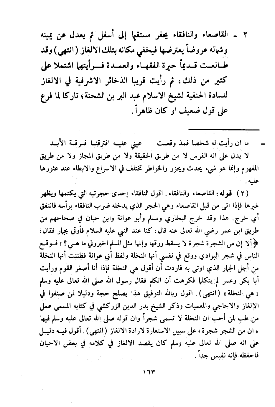 (2) قَوْلُهُ: الْقَاصِعَاءُ وَالنَّافِقَاءُ. أَقُولُ النَّافِقَاءُ إحْدَى حُجْرَتَيْهِ الَّتِي يَكْتُمُهَا وَيُظْهِرُ غَيْرَهَا فَإِذَا أَتَى مِنْ قِبَلِ الْقَاصِعَاءِ وَهَى الْحَجَرُ الَّذِي يَدْخُلُهُ فَضَرَبَ النَّافِقَاءَ بِرَأْسِهِ فَانْتَفَقَ أَيْ خَرَجَ. هَذَا وَقَدْ خَرَّجَ الْبُخَارِيُّ وَمُسْلِمٌ وَأَبُو عَوَانَةَ وَابْنُ حِبَّانَ فِي صِحَاحِهِمْ مِنْ طَرِيقِ ابْنِ عُمَرَ - رَضِيَ اللَّهُ تَعَالَى عَنْهُ - قَالَ: «كُنَّا عِنْدَ النَّبِيِّ - عَلَيْهِ السَّلَامُ - فَأُوتِيَ بِجِمَارٍ فَقَالَ: أَلَا إنَّ مِنْ الشَّجَرَةِ شَجَرَةٌ لَا يَسْقُطُ وَرَقُهَا وَإِنَّهَا مِثْلُ الْمُسْلِمِ أَخْبِرُونِي مَا هِيَ؟ فَوَقَعَ النَّاسُ فِي شَجَرِ الْبَوَادِي وَوَقَعَ فِي نَفْسِي أَنَّهَا النَّخْلَةُ» وَلَفْظِ أَبِي عَوَانَةَ «فَظَنَنْتُ أَنَّهَا النَّخْلَةُ مِنْ أَجْلِ الْجِمَارِ الَّذِي أُوتِيَ بِهِ فَأَرَدْت أَنْ أَقُولَ هِيَ النَّخْلَةُ فَإِذَا أَنَا أَصْغَرُ الْقَوْمِ وَرَأَيْت أَبَا بَكْرٍ وَعُمَرَ لَمْ يَتَكَلَّمَا فَكَرِهْتُ أَنْ أَتَكَلَّمَ فَقَالَ رَسُولُ اللَّهِ - صَلَّى اللَّهُ تَعَالَى عَلَيْهِ وَسَلَّمَ - هِيَ النَّخْلَةُ» (انْتَهَى) . أَقُولُ - وَبِاَللَّهِ التَّوْفِيقُ -: هَذَا يَصْلُحُ حُجَّةً وَدَلِيلًا لِمَنْ صَنَّفُوا فِي الْأَلْغَازِ وَالْأَحَاجِي وَالْمُعَمَّيَاتِ وَذَكَرَ الشَّيْخُ بَدْرُ الدِّينِ الزَّرْكَشِيُّ فِي كِتَابِهِ الْمُسَمَّى عَمَلٌ مِنْ طِبٍّ لِمَنْ أَحَبَّ أَنَّ النَّخْلَةَ لَا تُسَمَّى شَجَرًا وَأَنَّ قَوْلَهُ - صَلَّى اللَّهُ تَعَالَى عَلَيْهِ وَسَلَّمَ - فِيهَا " إنَّ مِنْ الشَّجَرِ شَجَرَةٌ " عَلَى سَبِيل الِاسْتِعَارَةِ لِإِرَادَةِ الْإِلْغَازِ (انْتَهَى) . أَقُولُ فِيهِ دَلِيلٌ عَلَى أَنَّهُ - صَلَّى اللَّهُ تَعَالَى عَلَيْهِ وَسَلَّمَ - كَانَ يَقْصِدُ الْإِلْغَازَ فِي كَلَامِهِ فِي بَعْضِ الْأَحْيَانِ فَاحْفَظْهُ فَإِنَّهُ نَفِيسٌ جِدًّا.