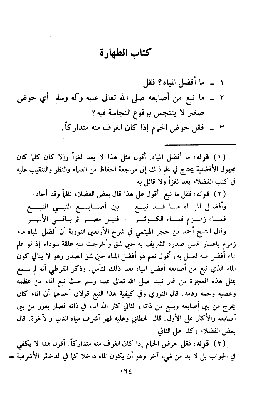 كِتَابُ الطَّهَارَةِ 1 - مَا أَفْضَلُ الْمِيَاهِ؟ فَقُلْ 2 - مَا نَبَعَ مِنْ أَصَابِعِهِ - صَلَّى اللَّهُ تَعَالَى عَلَيْهِ وَسَلَّمَ -. أَيُّ حَوْضٍ صَغِيرٍ لَا يَتَنَجَّسُ بِوُقُوعِ النَّجَاسَةِ فِيهِ؟ 3 - فَقُلْ حَوْضُ الْحَمَّامِ إذَا كَانَ الْغَرْفُ مِنْهُ مُتَدَارِكًا