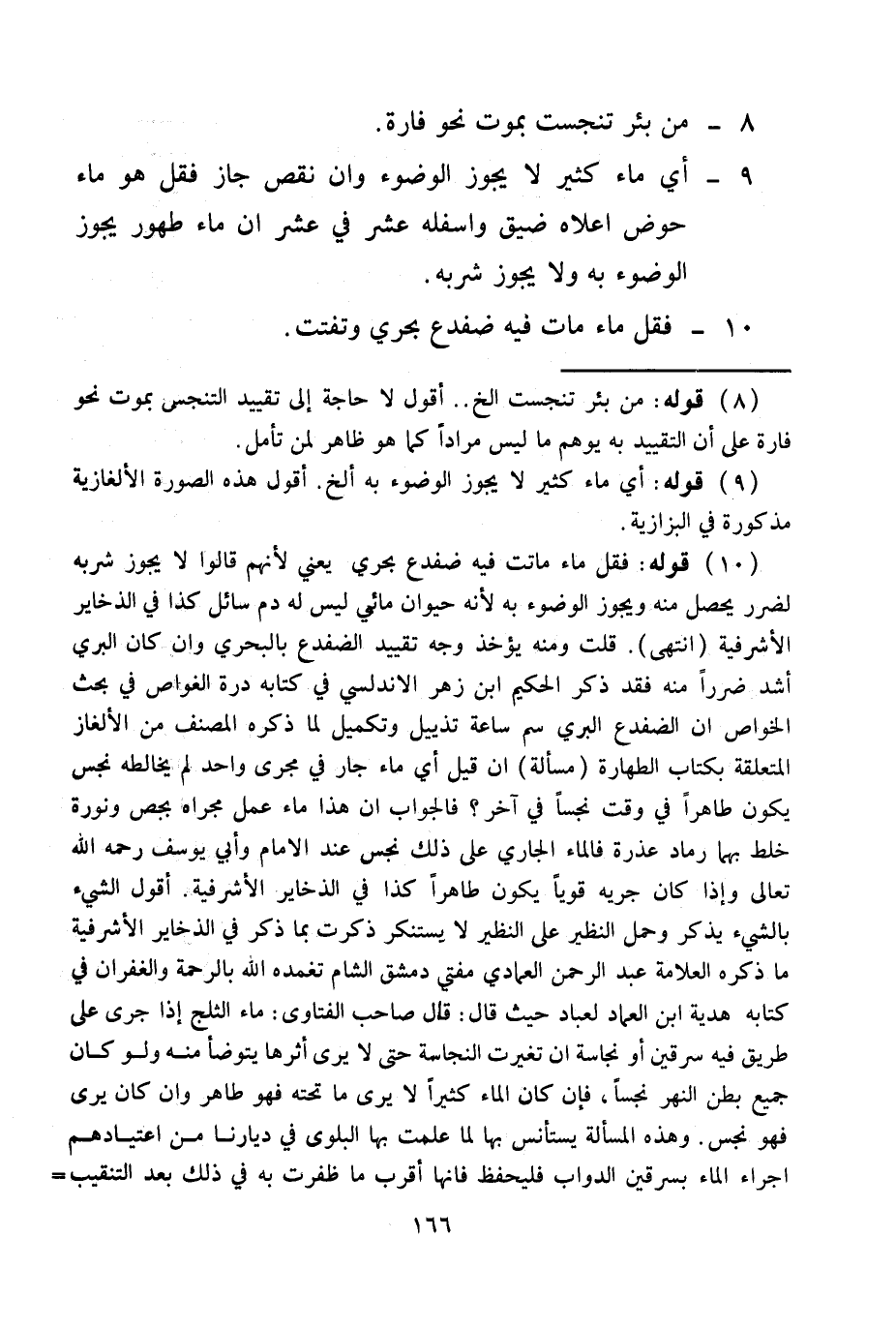 9 - قَوْلُهُ أَيُّ مَاءٍ كَثِيرٍ لَا يَجُوزُ الْوُضُوءُ وَإِنْ نَقَصَ جَازَ فَقُلْ هُوَ مَاءُ حَوْضٍ أَعْلَاهُ ضَيِّقٌ وَأَسْفَلُهُ عَشْرٌ فِي عَشْرٍ