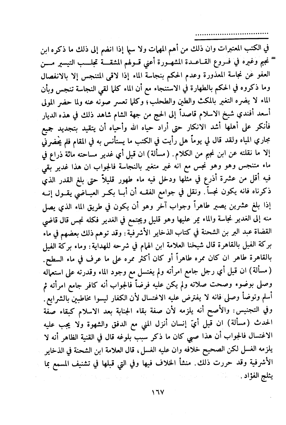 ـــــــــــــــــــــــــــــQفِي الْكُتُبِ الْمُعْتَبَرَاتِ وَأَنَّ ذَلِكَ مِنْ أَهَمِّ الْمُهَمَّاتِ وَلَا سِيَّمَا إذَا انْضَمَّ إلَى ذَلِكَ مَا ذَكَرَهُ ابْنُ نُجَيْمٍ وَغَيْرُهُ فِي فُرُوعِ الْقَاعِدَةِ الْمَشْهُورَةِ أَعْنِي قَوْلَهُمْ الْمَشَقَّةُ تَجْلِبُ التَّيْسِيرَ مِنْ الْعَفْوِ عَنْ نَجَاسَةِ الْمَعْذُورَةِ وَعَدَمِ الْحُكْمِ بِنَجَاسَةِ الْمَاءِ إذَا لَاقَى الْمُتَنَجِّسُ إلَّا بِالِانْفِصَالِ وَمَا ذَكَرُوهُ فِي الْحُكْمِ بِالطَّهَارَةِ فِي الِاسْتِنْجَاءِ مَعَ أَنَّ الْمَاءَ كُلَّمَا لَقِيَ النَّجَاسَةَ تَنَجَّسَ وَبِأَنَّ الْمَاءَ لَا يَضُرُّهُ التَّغَيُّرُ بِالْمُكْثِ وَالطِّينِ وَالطُّحْلُبِ؛ وَكُلَّمَا تَعَسَّرَ صَوْنُهُ عَنْهُ وَلَمَّا حَضَرَ الْمَوْلَى أَسْعَدُ أَفَنْدِي شَيْخُ الْإِسْلَامِ قَاصِدًا إلَى الْحَجِّ مِنْ جِهَةِ الشَّامِ شَاهَدَ ذَلِكَ فِي هَذِهِ الدِّيَارِ فَأَنْكَرَ عَلَى أَهْلِهَا أَشَدَّ الْإِنْكَارِ حَتَّى أَرَادَ حَيَّاهُ اللَّهُ وَأَحْيَاهُ أَنْ يَتَقَيَّدَ بِتَجْدِيدِ جَمِيعِ مَجَارِي الْمِيَاهِ وَلَقَدْ قَالَ لِي يَوْمًا هَلْ رَأَيْتَ فِي الْكُتُبِ مَا يُسْتَأْنَسُ بِهِ فِي الْمَقَامِ؟ فَلَمْ يَحْضُرْنِي إلَّا مَا نَقَلْتُهُ عَنْ ابْنِ نُجَيْمٍ مِنْ الْكَلَامِ