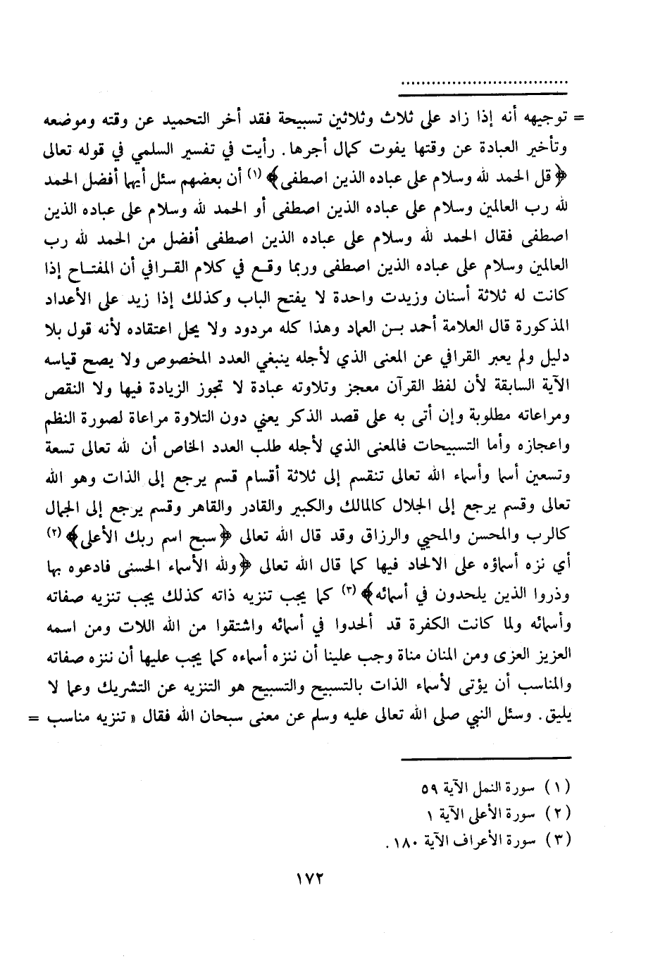 رَأَيْتُ فِي تَفْسِيرِ السُّلَمِيِّ فِي قَوْله تَعَالَى {قُلِ الْحَمْدُ لِلَّهِ وَسَلامٌ عَلَى عِبَادِهِ الَّذِينَ اصْطَفَى} [النمل: 59] أَنَّ بَعْضَهُمْ سُئِلَ أَيُّهُمَا أَفَضْلُ الْحَمْدُ لِلَّهِ رَبِّ الْعَالَمِينَ وَسَلَامٌ عَلَى عِبَادِهِ الَّذِينَ اصْطَفَى أَوْ الْحَمْدُ لِلَّهِ وَسَلَامٌ عَلَى عِبَادِهِ الَّذِينَ اصْطَفَى فَقَالَ الْحَمْدُ لِلَّهِ وَسَلَامٌ عَلَى عِبَادِهِ الَّذِينَ اصْطَفَى أَفْضَلُ مِنْ الْحَمْدُ لِلَّهِ رَبِّ الْعَالَمِينَ وَسَلَامٌ عَلَى عِبَادِهِ الَّذِينَ اصْطَفَى وَرُبَّمَا وَقَعَ فِي كَلَامِ الْقَرَافِيُّ أَنَّ الْمِفْتَاحَ إذَا كَانَتْ لَهُ ثَلَاثَةُ أَسْنَانٍ وَزِيدَتْ وَاحِدَةٌ لَا يَفْتَحُ الْبَابَ وَكَذَلِكَ إذَا زِيدَ عَلَى الْأَعْدَادِ الْمَذْكُورَةِ قَالَ الْعَلَّامَةُ أَحْمَدُ بْنُ الْعِمَادِ وَهَذَا كُلُّهُ مَرْدُودٌ وَلَا يَحِلُّ اعْتِقَادُهُ لِأَنَّهُ قَوْلٌ بِلَا دَلِيلٍ وَلَمْ يُعَبِّرْ الْقَرَافِيُّ عَنْ الْمَعْنَى الَّذِي لِأَجْلِهِ يَنْبَغِي الْعَدَدُ الْمَخْصُوصُ وَلَا يَصِحُّ قِيَاسُهُ الْآيَةَ السَّابِقَةَ لِأَنَّ لَفْظَ الْقُرْآنِ مُعْجِزٌ وَتِلَاوَتُهُ عِبَادَةٌ لَا تَجُوزُ الزِّيَادَةُ فِيهَا وَلَا النَّقْصُ وَمُرَاعَاتَهُ مَطْلُوبَةٌ وَإِنْ أَتَى بِهِ عَلَى قَصْدِ الذِّكْر يَعْنِي دُونَ التِّلَاوَةِ مُرَاعَاةً لِصُورَةِ النَّظْمِ وَإِعْجَازِهِ وَأَمَّا التَّسْبِيحَاتُ فَالْمَعْنَى الَّذِي لِأَجْلِهِ طُلِبَ الْعَدَدُ الْخَاصُّ أَنَّ لِلَّهِ تَعَالَى تِسْعَةً وَتِسْعِينَ اسْمًا وَأَسْمَاءُ اللَّهِ تَعَالَى تَنْقَسِمُ إلَى ثَلَاثَةِ أَقْسَامٍ قِسْمٌ يَرْجِعُ إلَى الذَّاتِ وَهُوَ اللَّهُ تَعَالَى وَقِسْمٌ يَرْجِعُ إلَى الْجَلَالِ كَالْمَالِكِ وَالْكَبِيرِ وَالْقَادِرِ وَالْقَاهِرِ وَقِسْمٌ يَرْجِعُ إلَى الْجَمَالِ كَالرَّبِّ وَالْمُحْسِنِ وَالْمُحْيِي وَالرَّزَّاقِ وَقَدْ قَالَ اللَّهُ تَعَالَى {سَبِّحِ اسْمَ رَبِّكَ الأَعْلَى} [الأعلى: 1] أَيْ نُزِّهَ أَسْمَاؤُهُ عَلَى الْإِلْحَادِ فِيهَا كَمَا قَالَ اللَّهُ تَعَالَى {وَلِلَّهِ الأَسْمَاءُ الْحُسْنَى فَادْعُوهُ بِهَا وَذَرُوا الَّذِينَ يُلْحِدُونَ فِي أَسْمَائِهِ} [الأعراف: 180] كَمَا يَجِبُ تَنْزِيهُ ذَاتِهِ كَذَلِكَ يَجِبُ تَنْزِيهُ صِفَاتِهِ وَأَسْمَائِهِ وَلَمَّا كَانَتْ الْكَفَرَةُ قَدْ أَلْحَدُوا فِي أَسْمَائِهِ وَاشْتَقُّوا مِنْ اللَّهِ اللَّاتِ وَمِنْ اسْمِهِ الْعَزِيزِ الْعُزَّى وَمِنْ الْمَنَّانِ مَنَاةَ وَجَبَ عَلَيْنَا أَنْ نُنَزِّهَ أَسْمَاءَهُ كَمَا يَجِبُ عَلَيْنَا أَنْ نُنَزِّهَ صِفَاتِهِ وَالْمُنَاسِبُ أَنْ يُؤْتَى لِأَسْمَاءِ الذَّاتِ بِالتَّسْبِيحِ، وَالتَّسْبِيحُ هُوَ التَّنْزِيهُ عَنْ التَّشْرِيكِ وَعَمَّا لَا يَلِيقُ.