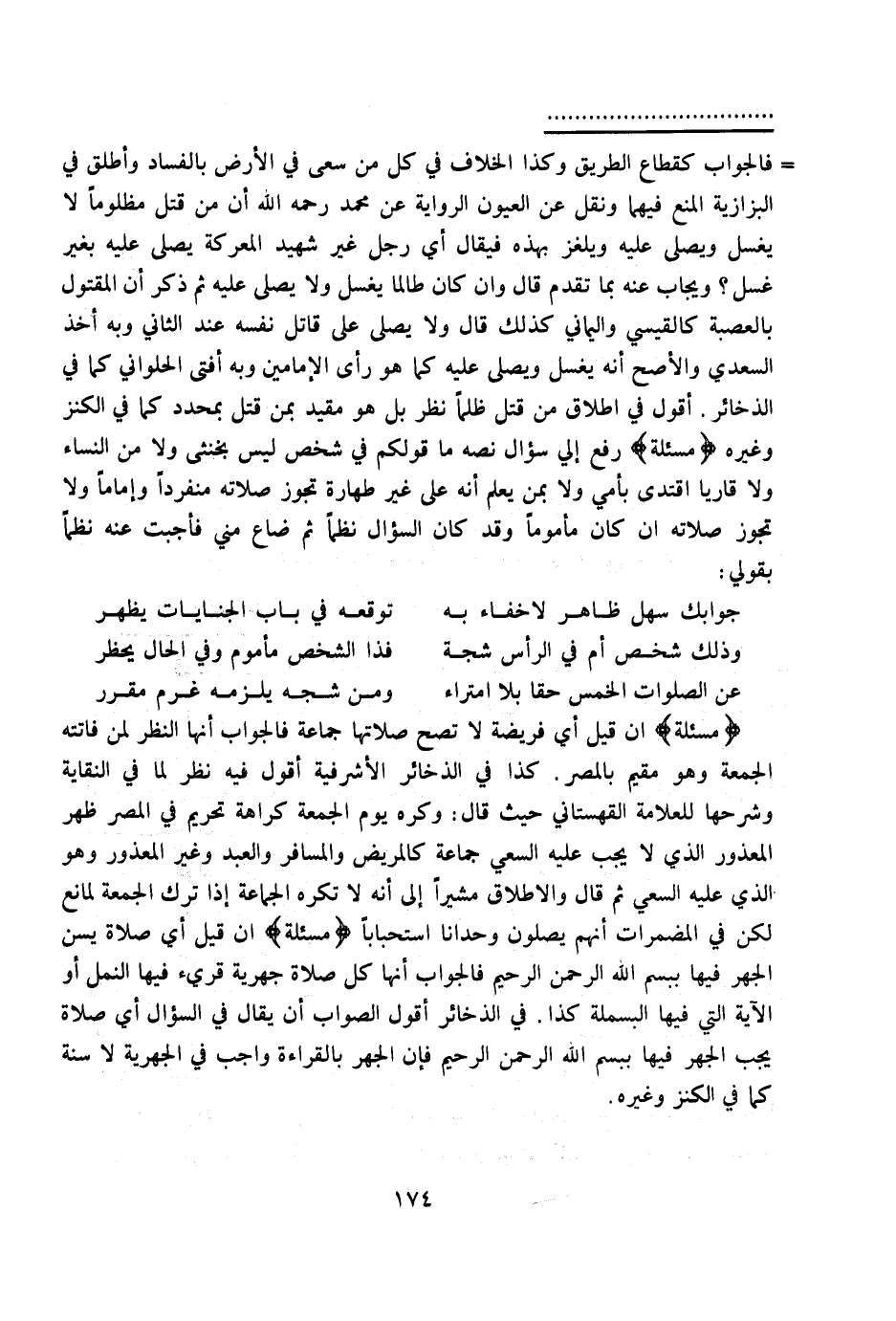 ـــــــــــــــــــــــــــــQفَالْجَوَابُ كَقُطَّاعِ الطَّرِيقِ وَكَذَا الْخِلَافُ فِي كُلِّ مَنْ سَعَى فِي الْأَرْضِ بِالْفَسَادِ وَأَطْلَقَ فِي الْبَزَّازِيَّةِ الْمَنْعَ فِيهِمَا وَنُقِلَ عَنْ الْعُيُونِ الرِّوَايَةُ عَنْ مُحَمَّدٍ - رَحِمَهُ اللَّهُ - أَنَّ مَنْ قُتِلَ مَظْلُومًا لَا يُغَسَّلُ وَيُصَلَّى عَلَيْهِ وَيُلْغَزُ بِهَذِهِ فَيُقَالُ أَيُّ رَجُلٍ غَيْرُ شَهِيدِ الْمَعْرَكَةِ يُصَلَّى عَلَيْهِ بِغَيْرِ غُسْلٍ؟ وَيُجَابُ عَنْهُ بِمَا تَقَدَّمَ قَالَ وَإِنْ كَانَ طَالَمَا يُغَسَّلُ وَلَا يُصَلَّى عَلَيْهِ ثُمَّ ذَكَرَ أَنَّ الْمَقْتُولَ بِالْعَصَبَةِ كَالْقَيْسِيِّ وَالْيَمَانِيِّ كَذَلِكَ قَالَ وَلَا يُصَلَّى عَلَى قَاتِلِ نَفْسَهُ عِنْدَ الثَّانِي وَبِهِ أَخَذَ السَّعْدِيُّ وَالْأَصَحُّ أَنَّهُ يُغَسَّلُ وَيُصَلَّى عَلَيْهِ كَمَا هُوَ رَأْيُ الْإِمَامَيْنِ وَبِهِ أَفْتَى الْحَلْوَانِيُّ كَمَا فِي الذَّخَائِرِ. أَقُولُ فِي إطْلَاقِ مَنْ قُتِلَ ظُلْمًا نَظَرٌ بَلْ هُوَ مُقَيَّدٌ بِمَنْ قُتِلَ بِمُحَدَّدٍ كَمَا فِي الْكَنْزِ وَغَيْرِهِ