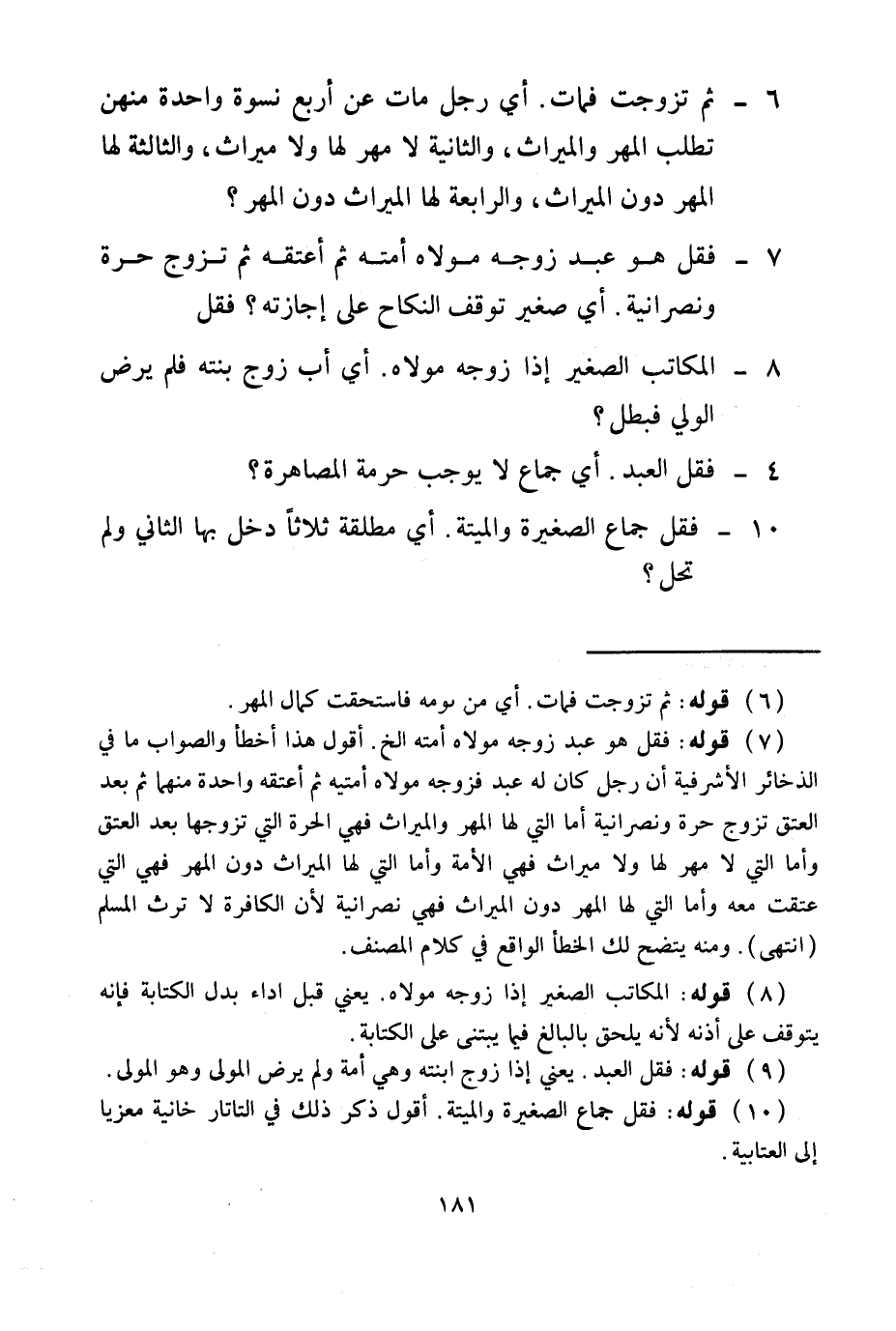 (7) قَوْلُهُ: فَقُلْ هُوَ عَبْدٌ زَوَّجَهُ مَوْلَاهُ أَمَتَهُ إلَخْ. أَقُولُ هَذَا أَخْطَأُ وَالصَّوَابُ مَا فِي الذَّخَائِرِ الْأَشْرَفِيَّةِ أَنَّ رَجُلًا كَانَ لَهُ عَبْدٌ فَزَوَّجَهُ مَوْلَاهُ أَمَتَيْهِ ثُمَّ أَعْتَقَهُ وَاحِدَةً مِنْهُمَا ثُمَّ بَعْدَ الْعِتْقِ تَزَوَّجَ حُرَّةً وَنَصْرَانِيَّةً أَمَّا الَّتِي لَهَا الْمَهْرُ وَالْمِيرَاثُ فَهِيَ الْحُرَّةُ الَّتِي تَزَوَّجَهَا بَعْدَ الْعِتْقِ وَأَمَّا الَّتِي لَا مَهْرَ لَهَا وَلَا مِيرَاثَ فَهِيَ الْأَمَةُ وَأَمَّا الَّتِي لَهَا الْمِيرَاثُ دُونَ الْمَهْرِ فَهِيَ الَّتِي عَتَقَتْ مَعَهُ وَأَمَّا الَّتِي لَهَا الْمَهْرُ دُونَ الْمِيرَاثِ فَهِيَ نَصْرَانِيَّةٌ لِأَنَّ الْكَافِرَةَ لَا تَرِثُ الْمُسْلِمَ (انْتَهَى) . وَمِنْهُ يَتَّضِحُ لَك الْخَطَأُ الْوَاقِعُ فِي كَلَامِ الْمُصَنِّفِ