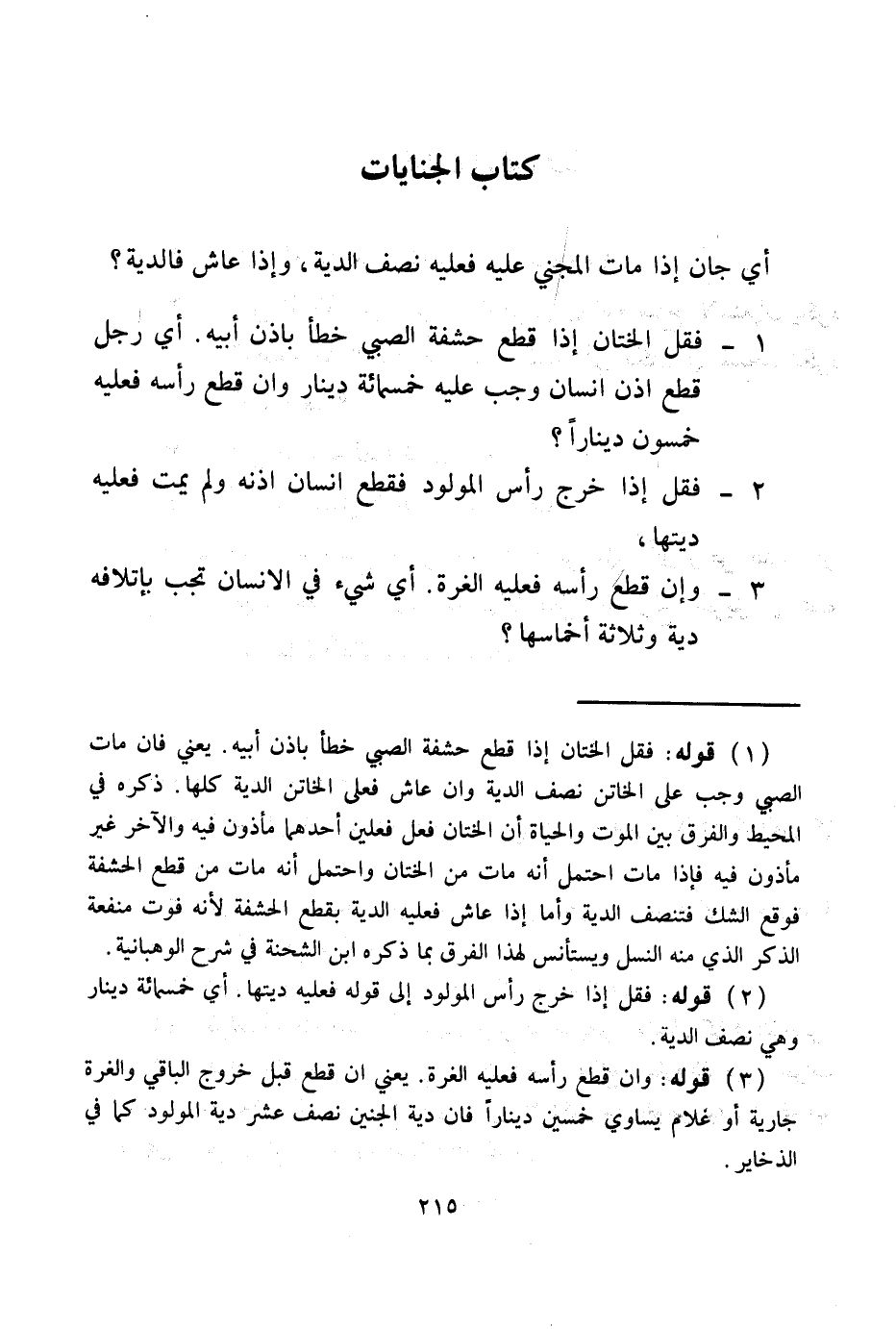 1 - فَقُلْ الْخِتَانُ إذَا قَطَعَ حَشَفَةَ الصَّبِيِّ خَطَأً بِإِذْنِ أَبِيهِ. أَيُّ رَجُلٍ قَطَعَ أُذُنَ إنْسَانٍ وَجَبَ عَلَيْهِ خَمْسُمِائَةِ دِينَارٍ وَإِنْ قَطَعَ رَأْسَهُ فَعَلَيْهِ خَمْسُونَ دِينَارًا؟