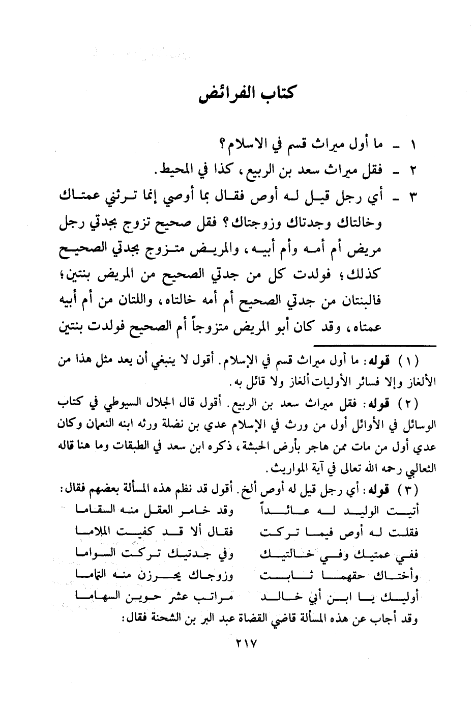 (2) قَوْلُهُ: فَقُلْ مِيرَاثُ سَعْدِ بْنِ الرَّبِيعِ. أَقُولُ قَالَ الْجَلَالُ السُّيُوطِيّ فِي كِتَابِ الْوَسَائِلِ فِي الْأَوَائِلِ أَوَّلُ مَنْ وُرِثَ فِي الْإِسْلَامِ عَدِيُّ بْنُ نَضْلَةَ وَرِثَهُ ابْنُهُ النُّعْمَانُ وَكَانَ عَدِيٌّ أَوَّلَ مَنْ مَاتَ مِمَّنْ هَاجَرَ بِأَرْضِ الْحَبَشَةِ، ذَكَرَهُ ابْنُ سَعْدٍ فِي الطَّبَقَاتِ وَمَا هُنَا قَالَهُ الثَّعَالِبِيُّ - رَحِمَهُ اللَّهُ تَعَالَى - فِي آيَةِ الْمَوَارِيثِ.