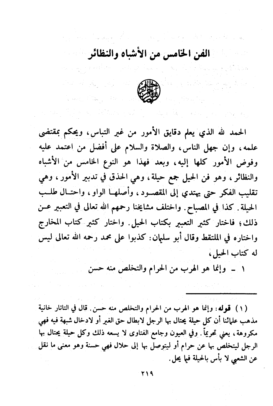 الْفَنُّ الْخَامِسُ مِنْ الْأَشْبَاهِ وَالنَّظَائِرِ بِسْمِ اللَّهِ الرَّحْمَنِ الرَّحِيمِ الْحَمْدُ لِلَّهِ الَّذِي يَعْلَمُ دَقَائِقَ الْأُمُورِ مِنْ غَيْرِ الْتِبَاسٍ، وَيْحُكُمْ بِمُقْتَضَى عِلْمِهِ، وَإِنْ جَهِلَ النَّاسُ، وَالصَّلَاةُ وَالسَّلَامُ عَلَى أَفْضَلِ مَنْ اعْتَمَدَ عَلَيْهِ وَفَوَّضَ الْأُمُورَ كُلَّهَا إلَيْهِ، وَبَعْدُ فَهَذَا هُوَ النَّوْعُ الْخَامِسُ مِنْ الْأَشْبَاهِ وَالنَّظَائِرِ، وَهُوَ فَنُّ الْحِيَلِ جَمْعُ حِيلَةٍ، وَهِيَ الْحِذْقُ فِي تَدْبِيرِ الْأُمُورِ، وَهِيَ تَقْلِيبُ الْفِكْرِ حَتَّى يَهْتَدِيَ إلَى الْمَقْصُودِ، وَأَصْلُهَا الْوَاوُ، وَاحْتَالَ طَلَبُ الْحِيلَةِ. كَذَا فِي الْمِصْبَاحِ. وَاخْتَلَفَ مَشَايِخُنَا رَحِمَهُمْ اللَّهُ تَعَالَى فِي التَّعْبِيرِ عَنْ ذَلِكَ؛ فَاخْتَارَ كَثِيرٌ التَّعْبِيرَ بِكِتَابِ الْحِيَلِ. وَاخْتَارَ كَثِيرٌ كِتَابَ الْمَخَارِجِ وَاخْتَارَهُ فِي الْمُلْتَقَطِ وَقَالَ أَبُو سُلَيْمَانَ: كَذَبُوا عَلَى مُحَمَّدٍ - رَحِمَهُ اللَّهُ تَعَالَى - لَيْسَ لَهُ كِتَابُ الْحِيَلِ،