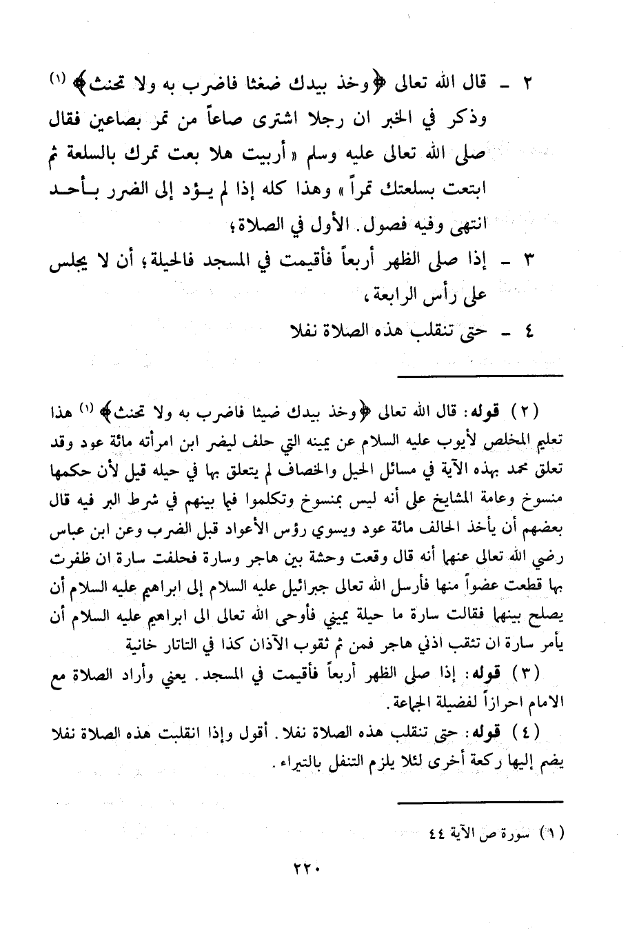 قَالَ اللَّهُ تَعَالَى {وَخُذْ بِيَدِكَ ضِغْثًا فَاضْرِبْ بِهِ وَلا تَحْنَثْ} [ص: 44] وَذَكَرَ فِي الْخَبَرِ أَنَّ «رَجُلًا اشْتَرَى صَاعًا مِنْ تَمْرٍ بِصَاعَيْنِ فَقَالَ - صَلَّى اللَّهُ تَعَالَى عَلَيْهِ وَسَلَّمَ - أَرْبَيْت هَلَّا بِعْت تَمْرَكَ بِالسِّلْعَةِ ثُمَّ ابْتَعْت بِسِلْعَتِكَ تَمْرًا» وَهَذَا كُلُّهُ إذَا لَمْ يُؤَدِّ إلَى الضَّرَرِ بِأَحَدٍ انْتَهَى وَفِيهِ فُصُولٌ. الْأَوَّلُ فِي الصَّلَاةِ؛