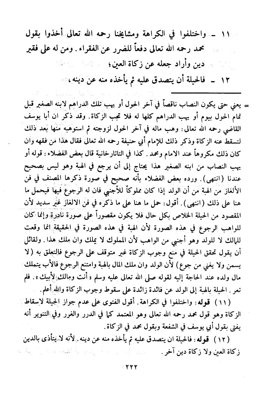 (11) قَوْلُهُ: وَاخْتَلَفُوا فِي الْكَرَاهَةِ. أَقُولُ الْفَتْوَى عَلَى عَدَمِ جَوَازِ الْحِيلَةِ لِإِسْقَاطِ الزَّكَاةِ وَهُوَ قَوْلُ مُحَمَّدٍ - رَحِمَهُ اللَّهُ تَعَالَى - وَهُوَ الْمُعْتَمَدُ كَمَا فِي الدُّرَرِ وَالْغُرَرِ وَفِي التَّنْوِيرِ أَنَّهُ يُفْتَى بِقَوْلِ أَبِي يُوسُفَ فِي الشُّفْعَةِ وَبِقَوْلِ مُحَمَّدٍ فِي الزَّكَاةِ.