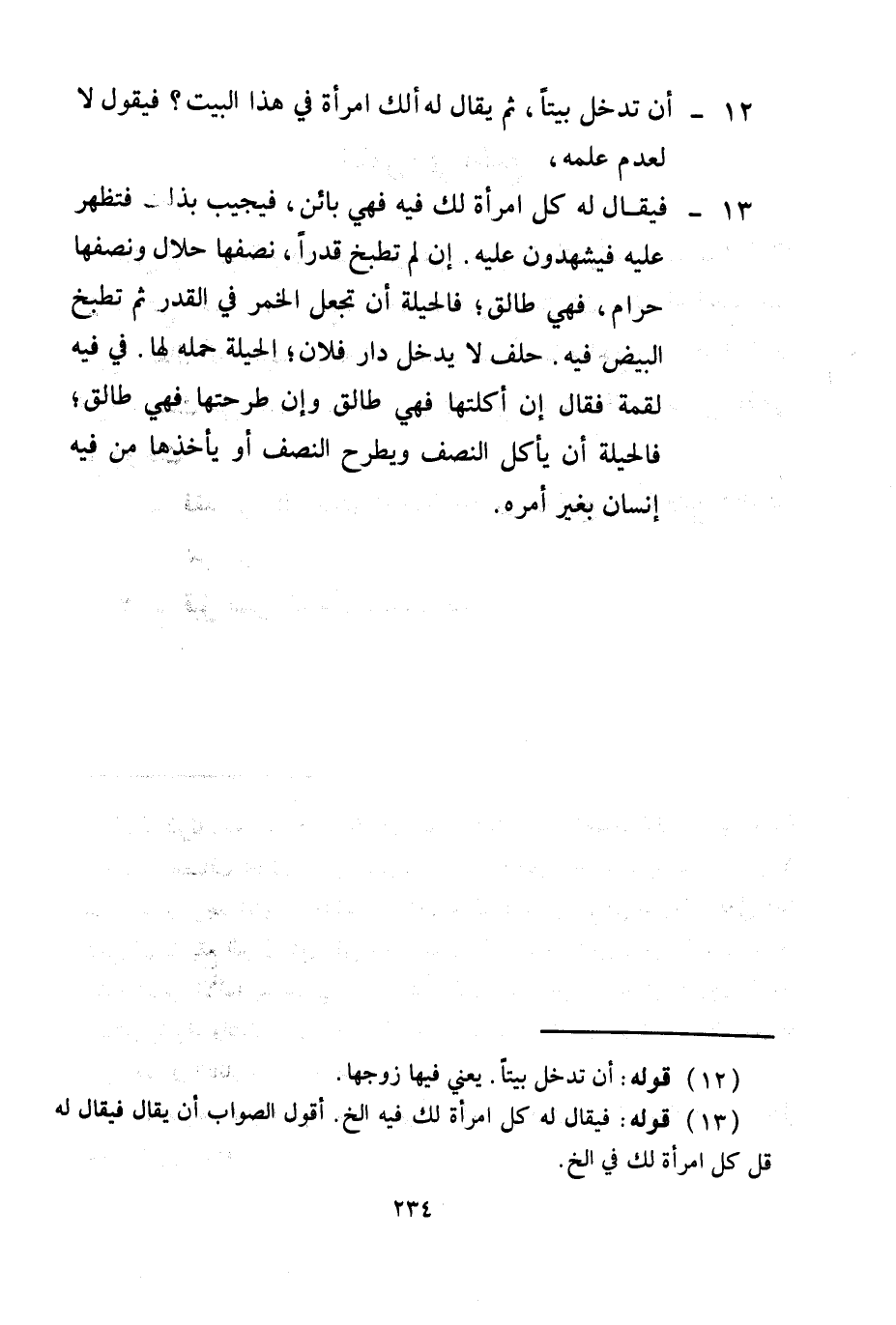 13 - فَيُقَالُ لَهُ كُلُّ امْرَأَةٍ لَكَ فِيهِ فَهِيَ بَائِنٌ، فَيُجِيبُ بِذَلِكَ فَتَظْهَرُ عَلَيْهِ فَيَشْهَدُونَ عَلَيْهِ. إنْ لَمْ تَطْبُخْ قِدْرًا، نِصْفُهَا حَلَالٌ وَنِصْفُهَا حَرَامٌ، فَهِيَ طَالِقٌ؛ فَالْحِيلَةُ أَنْ تَجْعَلَ الْخَمْرَ فِي الْقِدْرِ ثُمَّ تَطْبُخَ الْبَيْضَ فِيهِ. حَلَفَ لَا يَدْخُلُ دَارَ فُلَانٍ؛ الْحِيلَةُ حَمْلُهُ لَهَا. فِي فِيهِ لُقْمَةٌ فَقَالَ إنْ أَكَلْتهَا فَهِيَ طَالِقٌ وَإِنْ طَرَحَتْهَا فَهِيَ طَالِقٌ؛ فَالْحِيلَةُ أَنْ يَأْكُلَ النِّصْفَ وَيَطْرَحَ النِّصْفَ أَوْ يَأْخُذَهَا مِنْ فِيهِ إنْسَانٌ بِغَيْرِ أَمْرِهِ.