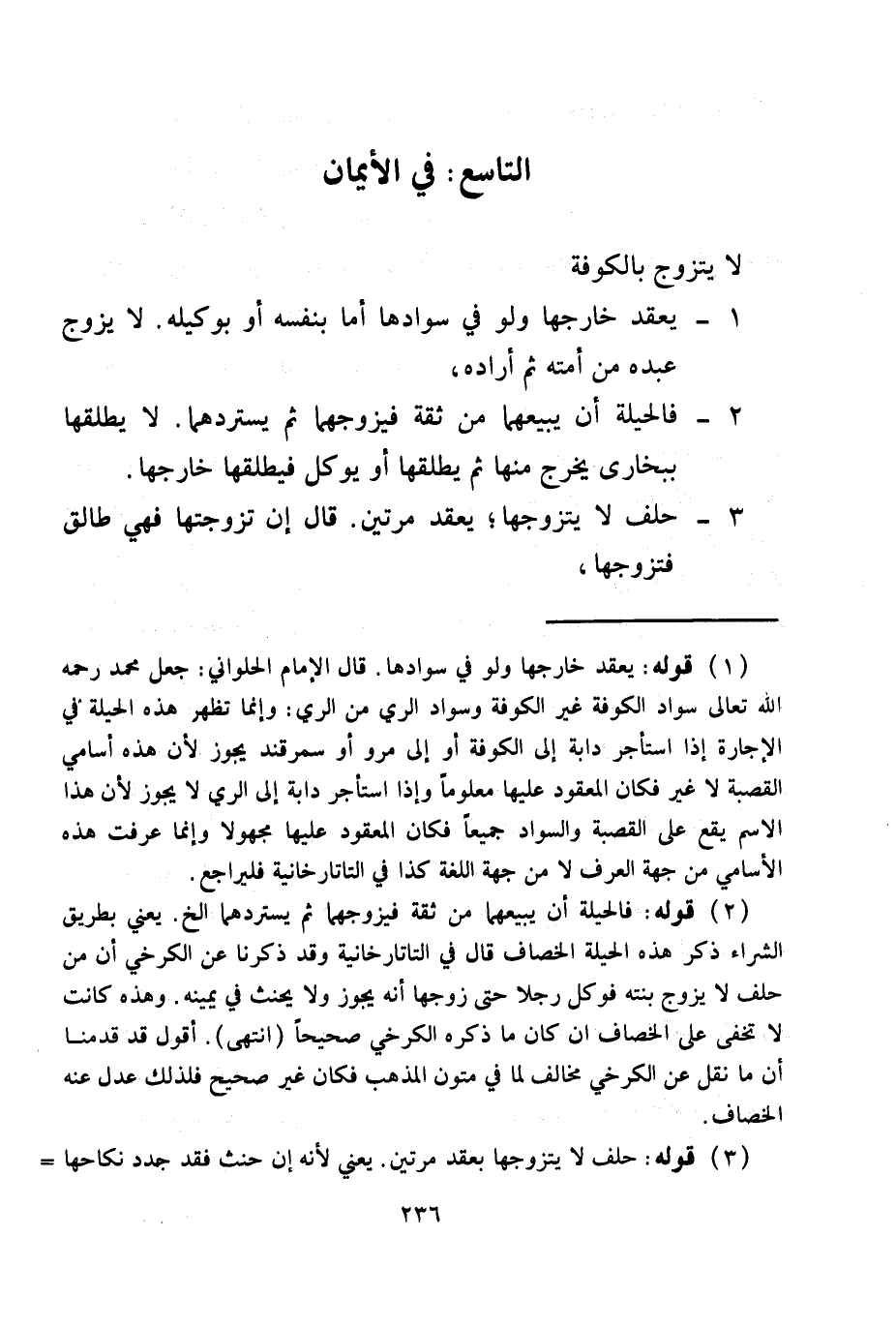 التَّاسِعُ: فِي الْأَيْمَانِ لَا يَتَزَوَّجُ بِالْكُوفَةِ