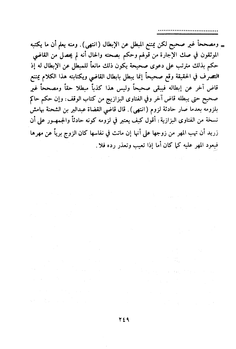 ـــــــــــــــــــــــــــــQوَمُصَحِّحًا غَيْرَ صَحِيحٍ لَكِنْ يَمْتَنِعُ الْمُبْطِلُ عَنْ الْإِبْطَالِ (انْتَهَى) . وَمِنْهُ يُعْلَمُ أَنَّ مَا يَكْتُبُهُ الْمُوَثِّقُونَ فِي صَكِّ الْإِجَارَةِ مِنْ قَوْلِهِمْ وَحُكِمَ بِصِحَّتِهِ وَالْحَالُ أَنَّهُ لَمْ يَحْصُلْ مِنْ الْقَاضِي حُكْمٌ بِذَلِكَ مُتَرَتِّبٌ عَلَى دَعْوَى صَحِيحَةٍ يَكُونُ ذَلِكَ مَانِعًا لِلْمُبْطِلِ عَنْ الْإِبْطَالِ لَهُ إذْ التَّصَرُّفُ فِي الْحَقِيقَةِ وَقَعَ صَحِيحًا إنَّمَا يَبْطُلُ بِإِبْطَالِ الْقَاضِي وَبِكِتَابَتِهِ هَذَا الْكَلَامَ يَمْتَنِعُ قَاضٍ آخَرُ عَنْ إبْطَالِهِ فَيَبْقَى صَحِيحًا وَلَيْسَ هَذَا كَذِبًا مُبْطِلًا حَقًّا وَمُصَحِّحًا غَيْرَ صَحِيحٍ حَتَّى يُبْطِلَهُ قَاضٍ آخَرُ وَفِي الْفَتَاوَى الْبَزَّازِيَّةِ مِنْ كِتَابِ الْوَقْفِ: وَإِنْ حَكَمَ حَاكِمٌ بِلُزُومِهِ بَعْدَمَا صَارَ حَادِثَةَ لُزُومٍ (انْتَهَى) . قَالَ قَاضِي الْقُضَاةِ عَبْدُ الْبَرِّ بْنُ الشِّحْنَةِ بِهَامِشِ نُسْخَةٍ مِنْ الْفَتَاوَى الْبَزَّازِيَّةِ: أَقُولُ كَيْفَ يُعْتَبَرُ فِي لُزُومِهِ كَوْنُهُ حَادِثًا وَالْجُمْهُورُ عَلَى أَنْ تُرِيدَ أَنْ تَهَبَ الْمَهْرَ مِنْ زَوْجِهَا عَلَى أَنَّهَا إنْ مَاتَتْ فِي نِفَاسِهَا كَانَ الزَّوْجُ بَرِيئًا عَنْ مَهْرِهَا فَيَعُودُ الْمَهْرُ عَلَيْهِ كَمَا كَانَ أَمَّا إذَا تَعَيَّبَ وَتَعَذَّرَ رَدُّهُ فَلَا.