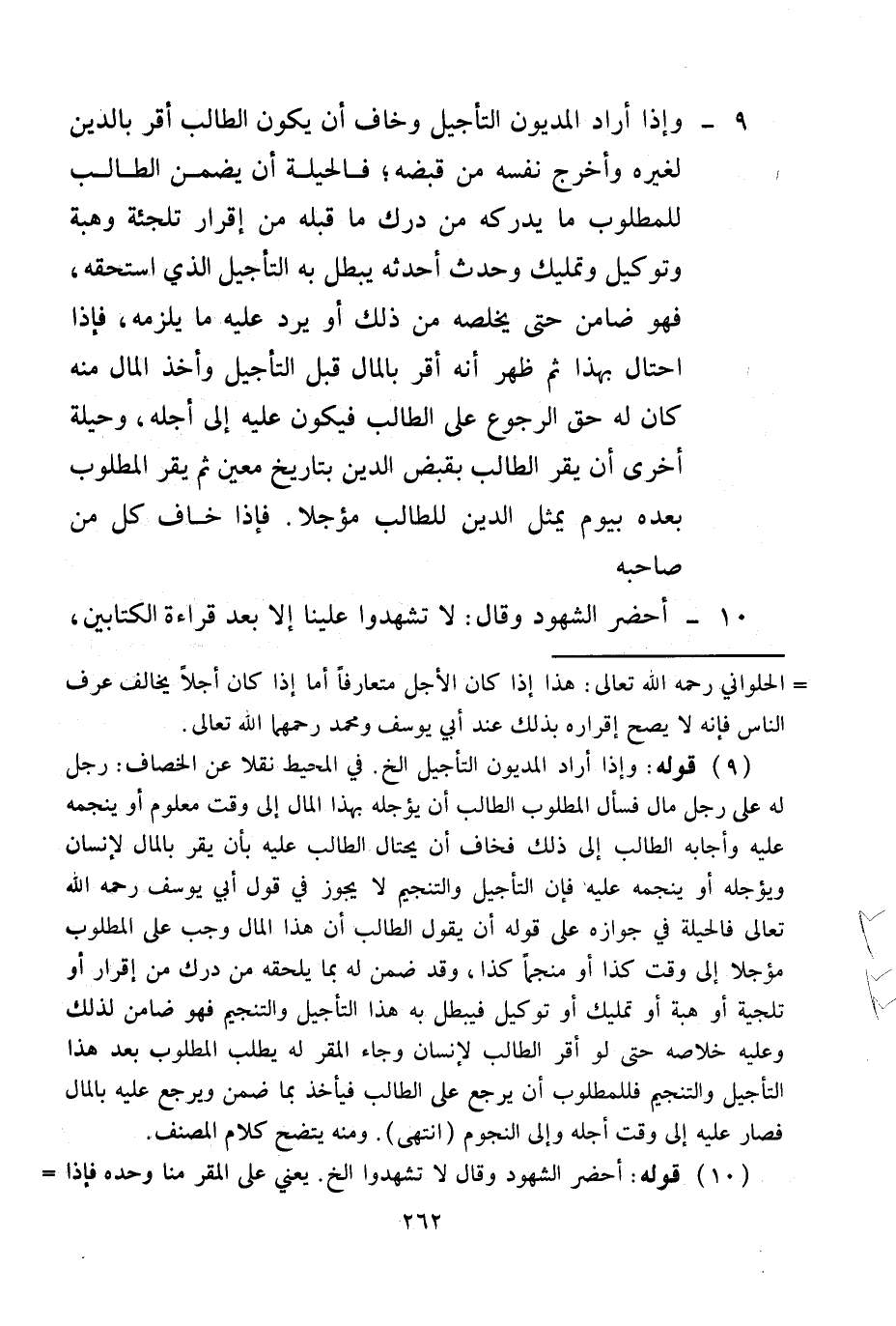 وَإِذَا أَرَادَ الْمَدْيُونُ التَّأْجِيلَ وَخَافَ أَنْ يَكُونَ الطَّالِبُ أَقَرَّ بِالدَّيْنِ لِغَيْرِهِ وَأَخْرَجَ نَفْسَهُ مِنْ قَبْضِهِ؛ فَالْحِيلَةُ أَنْ يَضْمَنَ الطَّالِبُ لِلْمَطْلُوبِ مَا يُدْرِكُهُ مِنْ دَرْكِ مَا قَبْلَهُ مِنْ إقْرَارِ تَلْجِئَةٍ وَهِبَةٍ وَتَوْكِيلٍ وَتَمْلِيكٍ وَحَدَثٍ أَحْدَثَهُ يَبْطُلُ بِهِ التَّأْجِيلُ الَّذِي اسْتَحَقَّهُ، فَهُوَ ضَامِنٌ حَتَّى يُخَلِّصَهُ مِنْ ذَلِكَ أَوْ يَرُدَّ عَلَيْهِ مَا يَلْزَمُهُ، فَإِذَا احْتَالَ بِهَذَا ثُمَّ ظَهَرَ أَنَّهُ أَقَرَّ بِالْمَالِ قَبْلَ التَّأْجِيلِ وَأَخْذِ الْمَالِ مِنْهُ كَانَ لَهُ حَقُّ الرُّجُوعِ عَلَى الطَّالِبِ فَيَكُونُ عَلَيْهِ إلَى أَجَلِهِ، وَحِيلَةٌ أُخْرَى أَنْ يُقِرَّ الطَّالِبُ بِقَبْضِ الدَّيْنِ بِتَارِيخٍ مُعَيَّنٍ ثُمَّ يُقِرَّ الْمَطْلُوبَ بَعْدَهُ بِيَوْمٍ يُمَثِّلُ الدَّيْنُ لِلطَّالِبِ مُؤَجَّلًا. فَإِذَا خَافَ كُلٌّ مِنْ صَاحِبِهِ