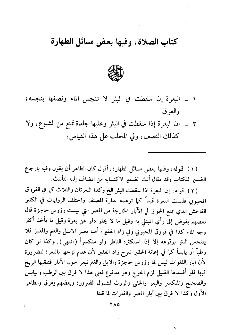 بِسْمِ اللَّهِ الرَّحْمَنِ الرَّحِيمِ 1 - الْبَعْرَةُ إنْ سَقَطَتْ فِي الْبِئْرِ لَا تُنَجِّسُ الْمَاءَ وَنِصْفُهَا يُنَجِّسُهُ؛ وَالْفَرْقُ
