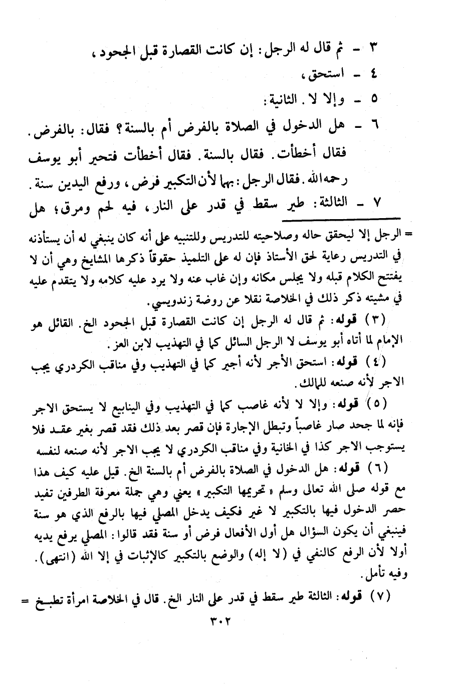 6 - هَلْ الدُّخُولُ فِي الصَّلَاةِ بِالْفَرْضِ أَمْ بِالسُّنَّةِ؟ فَقَالَ: بِالْفَرْضِ. فَقَالَ أَخْطَأْتَ. فَقَالَ بِالسُّنَّةِ. فَقَالَ أَخْطَأْتَ فَتَحَيَّرَ أَبُو يُوسُفَ - رَحِمَهُ اللَّهُ -. فَقَالَ الرَّجُلُ: بِهِمَا لِأَنَّ التَّكْبِيرَ فَرْضٌ، وَرَفْعَ الْيَدَيْنِ سُنَّةٌ