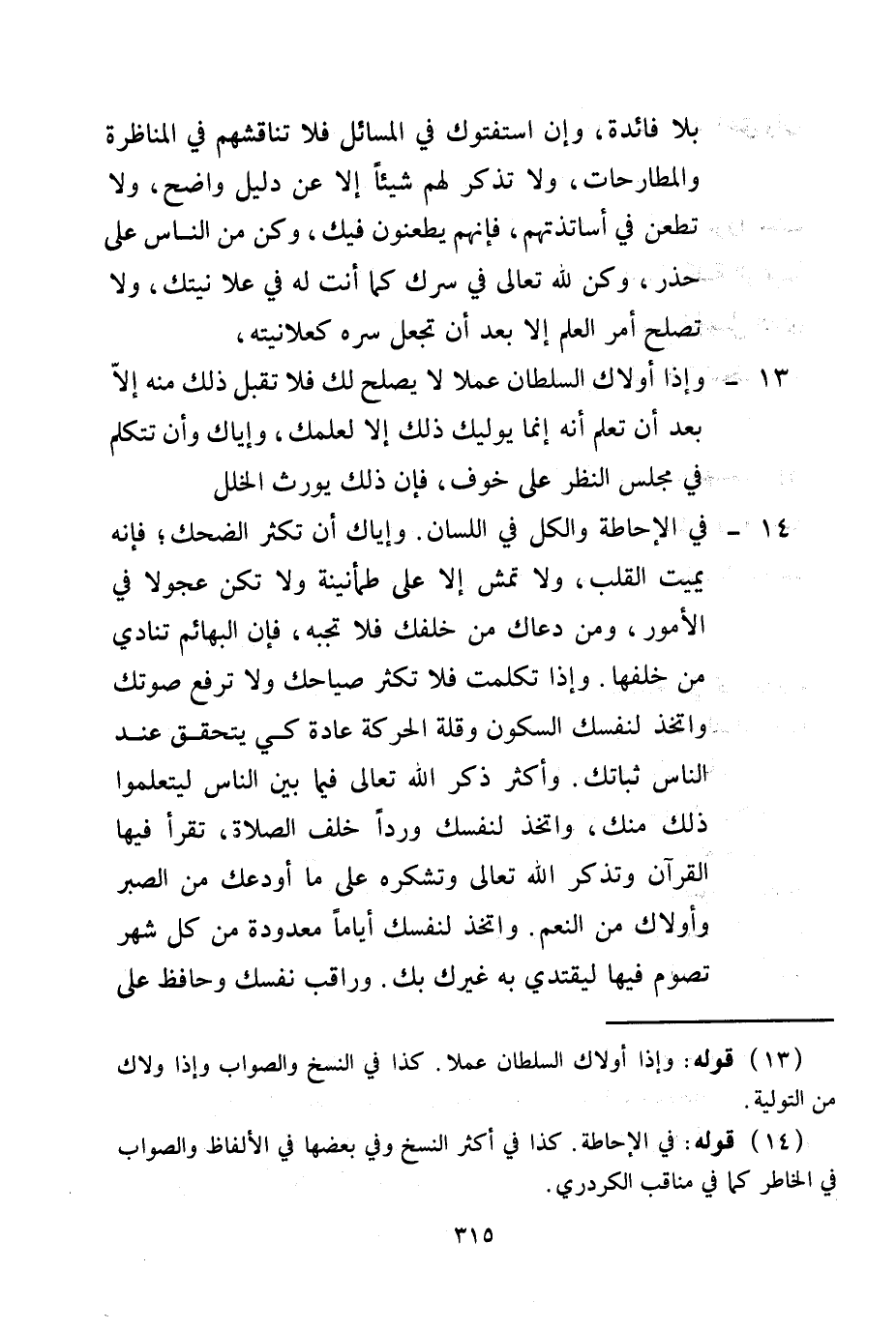 14 - فِي الْإِحَاطَةِ وَالْكَلَّ فِي اللِّسَانِ وَإِيَّاكَ أَنْ تُكْثِرَ الضَّحِكَ؛ فَإِنَّهُ يُمِيتُ الْقَلْبَ، وَلَا تَمْشِ إلَّا عَلَى طُمَأْنِينَةٍ وَلَا تَكُنْ عَجُولًا فِي الْأُمُورِ، وَمَنْ دَعَاك مِنْ خَلْفِك فَلَا تُجِبْهُ، فَإِنَّ الْبَهَائِمَ تُنَادَى مِنْ خَلْفِهَا وَإِذَا تَكَلَّمْت فَلَا تُكْثِرْ صِيَاحَك وَلَا تَرْفَعْ صَوْتَك وَاِتَّخِذْ لِنَفْسِك السُّكُونَ وَقِلَّةَ الْحَرَكَةِ عَادَةً كَيْ يَتَحَقَّقَ عِنْدَ النَّاسِ ثَبَاتُك.