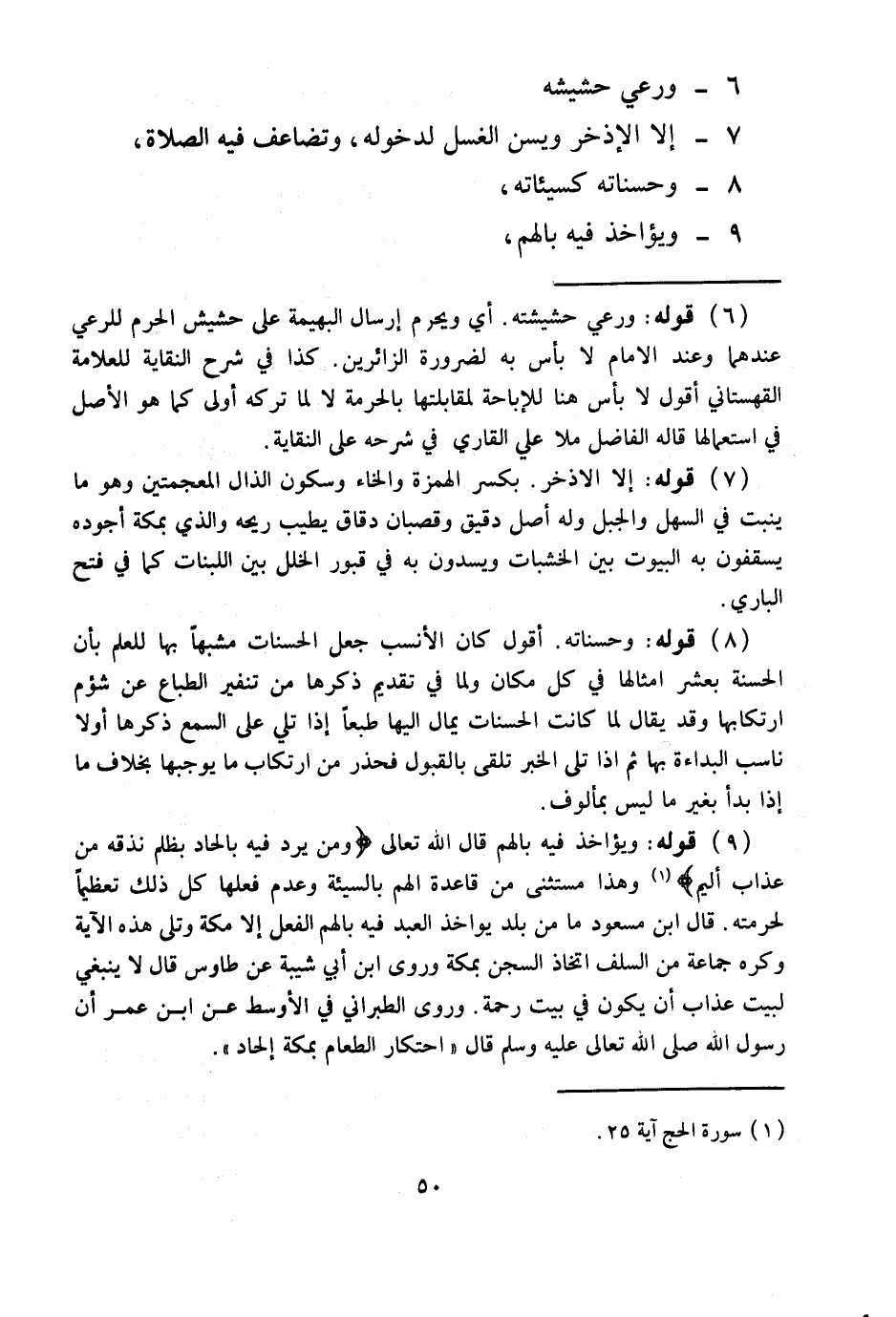 (9) قَوْلُهُ: وَيُؤَاخَذُ فِيهِ بِالْهَمِّ قَالَ اللَّهُ تَعَالَى {وَمَنْ يُرِدْ فِيهِ بِإِلْحَادٍ بِظُلْمٍ نُذِقْهُ مِنْ عَذَابٍ أَلِيمٍ} [الحج: 25] وَهَذَا مُسْتَثْنًى مِنْ قَاعِدَةِ " الْهَمُّ بِالسَّيِّئَةِ وَعَدَمُ فِعْلِهَا " كُلُّ ذَلِكَ تَعْظِيمًا لِحُرْمَتِهِ. قَالَ ابْنُ مَسْعُودٍ: مَا مِنْ بَلَدٍ يُؤَاخَذُ الْعَبْدُ فِيهِ بِالْهَمِّ بِالْفِعْلِ إلَّا مَكَّةَ وَتَلَا هَذِهِ الْآيَةَ وَكَرِهَ جَمَاعَةٌ مِنْ السَّلَفِ اتِّخَاذَ السَّجْنِ بِمَكَّةَ وَرَوَى ابْنُ أَبِي شَيْبَةَ عَنْ طَاوُسٍ قَالَ: لَا يَنْبَغِي لِبَيْتِ عَذَابٍ أَنْ يَكُونَ فِي بَيْتِ رَحْمَةٍ. وَرَوَى الطَّبَرَانِيُّ فِي الْأَوْسَطِ عَنْ ابْنِ عُمَرَ أَنَّ رَسُولَ اللَّهِ - صَلَّى اللَّهُ تَعَالَى عَلَيْهِ وَسَلَّمَ - قَالَ «احْتِكَارُ الطَّعَامِ بِمَكَّةَ إلْحَادٌ»