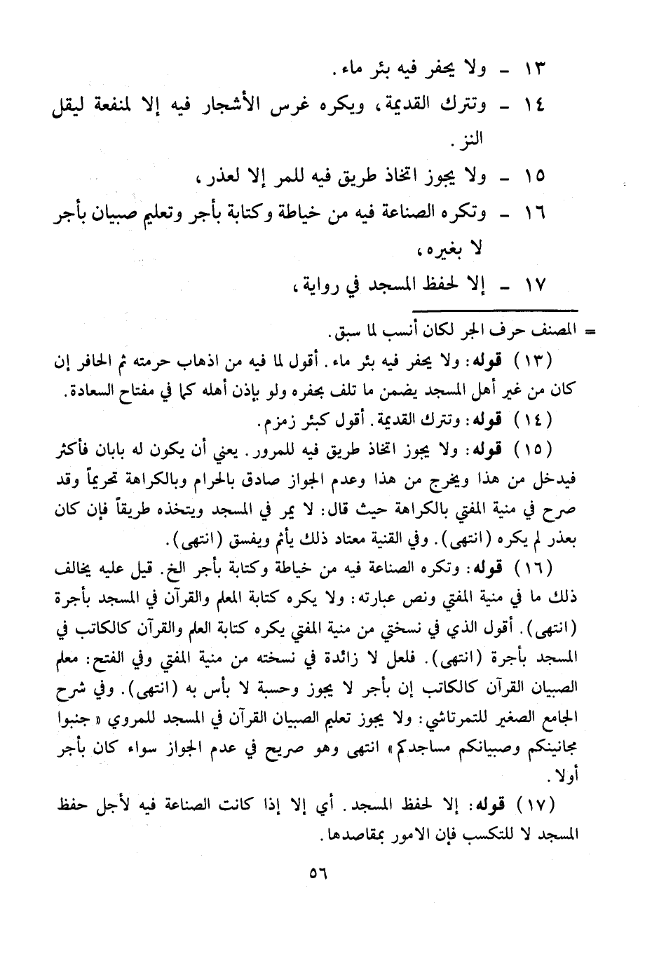 (13) قَوْلُهُ: وَلَا يُحْفَرُ فِيهِ بِئْرُ مَاءٍ. أَقُولُ: لِمَا فِيهِ مِنْ إذْهَابِ حُرْمَتِهِ، ثُمَّ الْحَافِرُ إنْ كَانَ مِنْ غَيْرِ أَهْلِ الْمَسْجِدِ يَضْمَنُ مَا تَلِفَ بِحَفْرِهِ وَلَوْ بِإِذْنِ أَهْلِهِ كَمَا فِي مِفْتَاحِ السَّعَادَةِ.