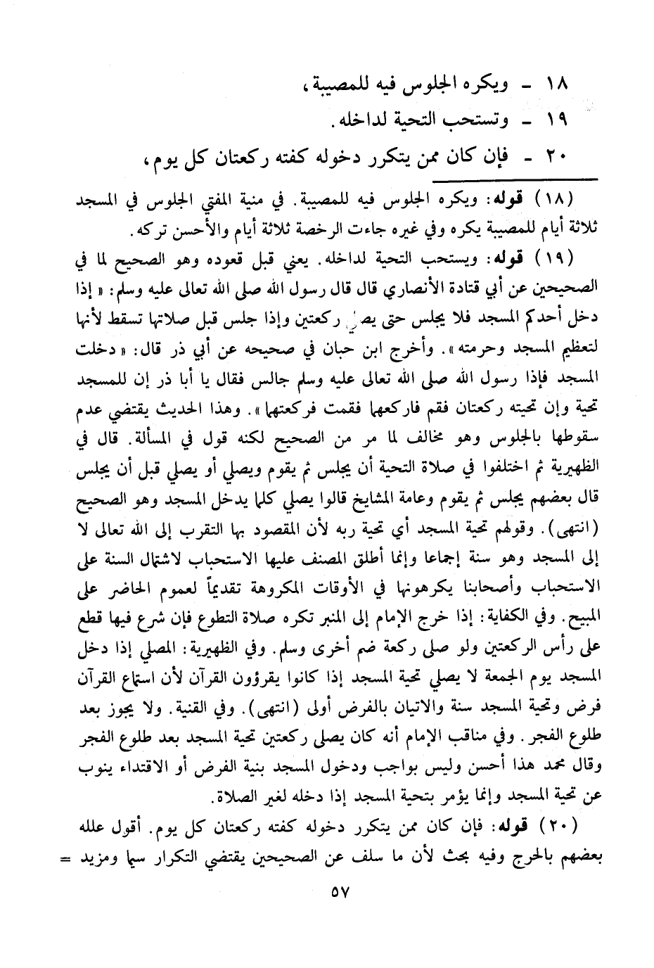 (20) قَوْلُهُ: فَإِنْ كَانَ مِمَّنْ يَتَكَرَّرُ دُخُولُهُ كَفَتْهُ رَكْعَتَانِ كُلَّ يَوْمٍ. أَقُولُ عَلَّلَهُ بَعْضُهُمْ بِالْحَرَجِ وَفِيهِ بَحْثٌ؛ لِأَنَّ مَا سَلَفَ عَنْ الصَّحِيحَيْنِ يَقْتَضِي التَّكْرَارَ سِيَّمَا وَمَزِيدُ
