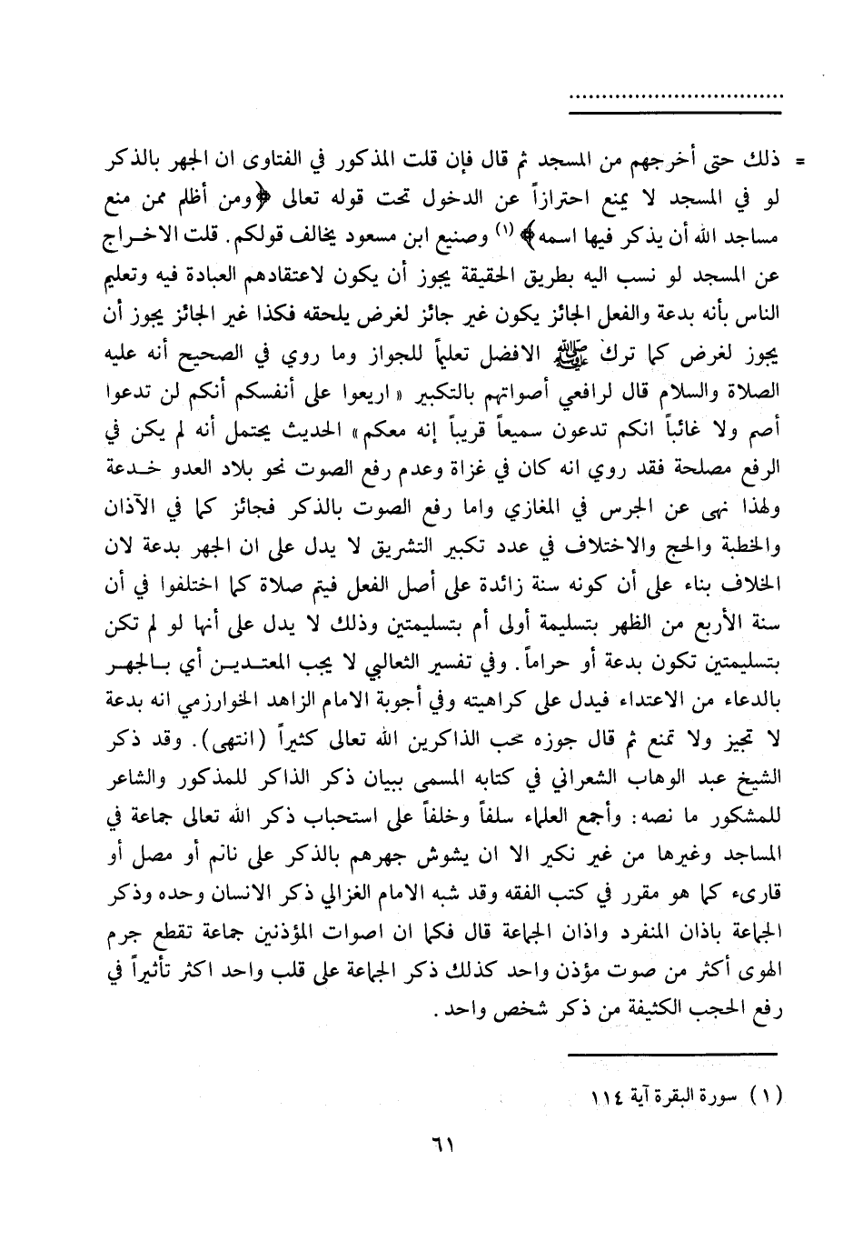وَقَدْ ذَكَرَ الشَّيْخُ عَبْدُ الْوَهَّابِ الشَّعْرَانِيُّ فِي كِتَابِهِ الْمُسَمَّى بِبَيَانِ ذِكْرِ الذَّاكِرِ لِلْمَذْكُورِ وَالشَّاكِرِ لِلْمَشْكُورِ مَا نَصُّهُ: وَأَجْمَعَ الْعُلَمَاءُ سَلَفًا وَخَلَفًا عَلَى اسْتِحْبَابِ ذِكْرِ اللَّهِ تَعَالَى جَمَاعَةً فِي الْمَسَاجِدِ وَغَيْرِهَا مِنْ غَيْرِ نَكِيرٍ إلَّا أَنْ يُشَوِّشَ جَهْرُهُمْ بِالذِّكْرِ عَلَى نَائِمٍ أَوْ مُصَلٍّ أَوْ قَارِئٍ كَمَا هُوَ مُقَرَّرٌ فِي كُتُبِ الْفِقْهِ، وَقَدْ شَبَّهَ الْإِمَامُ الْغَزَالِيُّ ذِكْرَ الْإِنْسَانِ وَحْدَهُ وَذِكْرَ الْجَمَاعَةِ بِأَذَانِ الْمُنْفَرِدِ وَأَذَانِ الْجَمَاعَةِ قَالَ: فَكَمَا أَنَّ أَصْوَاتَ الْمُؤَذِّنِينَ جَمَاعَةً تَقْطَعُ جُرْمَ الْهَوَى أَكْثَرَ مِنْ صَوْتِ مُؤَذِّنٍ وَاحِدٍ كَذَلِكَ ذِكْرُ الْجَمَاعَةِ عَلَى قَلْبٍ وَاحِدٍ أَكْثَرُ تَأْثِيرًا فِي رَفْعِ الْحُجُبِ الْكَثِيفَةِ مِنْ ذِكْرِ شَخْصٍ وَاحِدٍ.