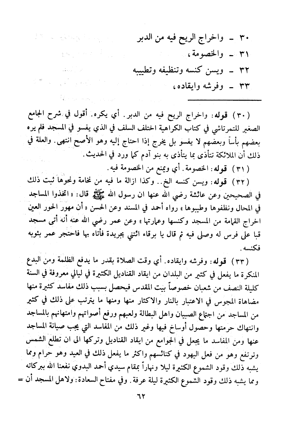 32 - وَيُسَنُّ كَنْسُهُ وَتَنْظِيفُهُ وَتَطْيِيبُهُ