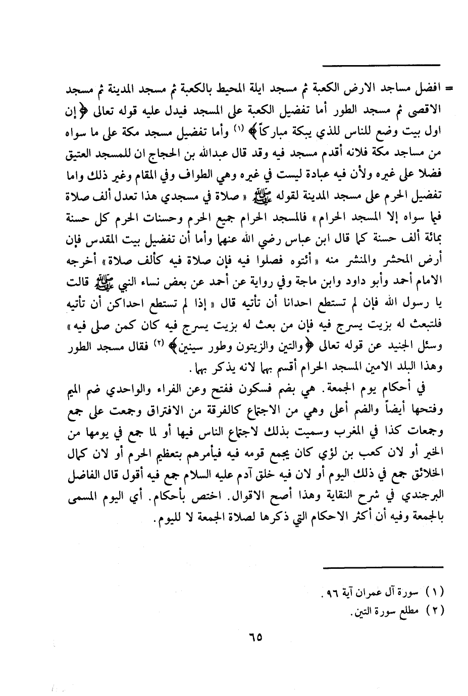 ـــــــــــــــــــــــــــــQأَفْضَلَ مَسَاجِدِ الْأَرْضِ الْكَعْبَةُ ثُمَّ مَسْجِدُ أَيْلَةَ الْمُحِيطِ بِالْكَعْبَةِ ثُمَّ مَسْجِدُ الْمَدِينَةِ ثُمَّ مَسْجِدُ الْأَقْصَى ثُمَّ مَسْجِدُ الطُّورِ أَمَّا تَفْضِيلُ الْكَعْبَةِ عَلَى الْمَسْجِدِ فَيَدُلُّ عَلَيْهِ قَوْلُهُ تَعَالَى {إِنَّ أَوَّلَ بَيْتٍ وُضِعَ لِلنَّاسِ لَلَّذِي بِبَكَّةَ مُبَارَكًا} [آل عمران: 96] وَأَمَّا تَفْضِيلُ مَسْجِدِ مَكَّةَ عَلَى مَا سِوَاهُ مِنْ مَسَاجِدِ مَكَّةَ فَلِأَنَّهُ أَقْدَمُ مَسْجِدٍ فِيهِ وَقَدْ قَالَ عَبْدُ اللَّهِ بْنُ الْحَجَّاجِ: إنَّ لِلْمَسْجِدِ الْعَتِيقِ فَضْلًا عَلَى غَيْرِهِ وَلِأَنَّ فِيهِ عِبَادَةٌ لَيْسَتْ فِي غَيْرِهِ وَهِيَ الطَّوَافُ وَفِي الْمُقَامِ وَغَيْرِ ذَلِكَ، وَأَمَّا تَفْضِيلُ الْحَرَمِ عَلَى مَسْجِدِ الْمَدِينَةِ لِقَوْلِهِ - صَلَّى اللَّهُ عَلَيْهِ وَسَلَّمَ - «صَلَاةٌ فِي مَسْجِدِي هَذَا تَعْدُلُ أَلْفَ صَلَاةٍ فِيمَا سِوَاهُ إلَّا الْمَسْجِدَ الْحَرَامَ» فَالْمَسْجِدُ الْحَرَامُ جَمِيعُ الْحَرَمِ وَحَسَنَاتُ الْحَرَمِ كُلُّ حَسَنَةٍ بِمِائَةِ أَلْفٍ حَسَنَةٍ كَمَا قَالَ ابْنُ عَبَّاسٍ - رَضِيَ اللَّهُ عَنْهُمَا - وَأَمَّا أَنَّ تَفْضِيلَ بَيْتِ الْمَقْدِسِ فَإِنَّ أَرْضَ الْمَحْشَرِ وَالْمَنْشَرِ مِنْهُ «ائْتُوهُ فَصَلُّوا فِيهِ فَإِنَّ صَلَاةً فِيهِ كَأَلْفِ صَلَاةٍ» أَخْرَجَهُ الْإِمَامُ أَحْمَدُ وَأَبُو دَاوُد وَابْنُ مَاجَهْ وَفِي رِوَايَةٍ عَنْ أَحْمَدَ «عَنْ بَعْضِ نِسَاءِ النَّبِيِّ - صَلَّى اللَّهُ عَلَيْهِ وَسَلَّمَ - قَالَتْ يَا رَسُولَ اللَّهِ فَإِنْ لَمْ تَسْتَطِعْ إحْدَانَا أَنْ تَأْتِيَهُ قَالَ إذَا لَمْ تَسْتَطِعْ إحْدَاكُنَّ أَنْ تَأْتِيَهُ فَلْتَبْعَثْ لَهُ بِزَيْتٍ يُسْرَجُ فِيهِ فَإِنَّ مَنْ بَعَثَ لَهُ بِزَيْتٍ يُسْرَجُ فِيهِ كَانَ كَمَنْ صَلَّى فِيهِ» وَسُئِلَ الْجُنَيْدُ عَنْ قَوْله تَعَالَى {وَالتِّينِ وَالزَّيْتُونِ} [التين: 1] {وَطُورِ سِينِينَ} [التين: 2] فَقَالَ مَسْجِدُ الطُّورِ وَهَذَا الْبَلَدُ الْأَمِينُ الْمَسْجِدُ الْحَرَامُ أُقْسِمُ بِهِمَا؛ لِأَنَّهُ يَذْكُرُ بِهِمَا.