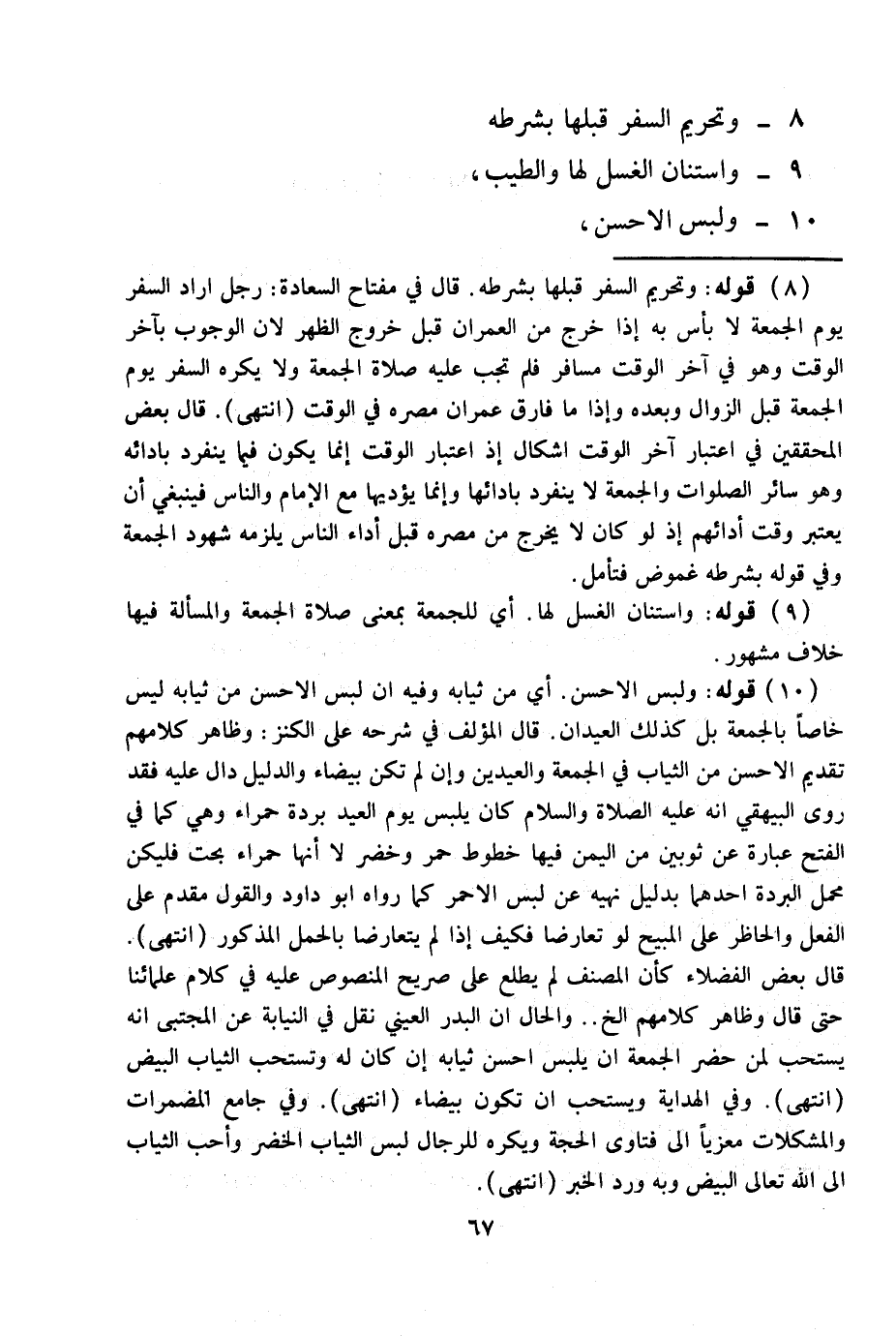 (9) قَوْلُهُ: وَاسْتِنَانِ الْغُسْلِ لَهَا. أَيْ لِلْجُمُعَةِ بِمَعْنَى صَلَاةِ الْجُمُعَةِ وَالْمَسْأَلَةُ فِيهَا خِلَافٌ مَشْهُورٌ.