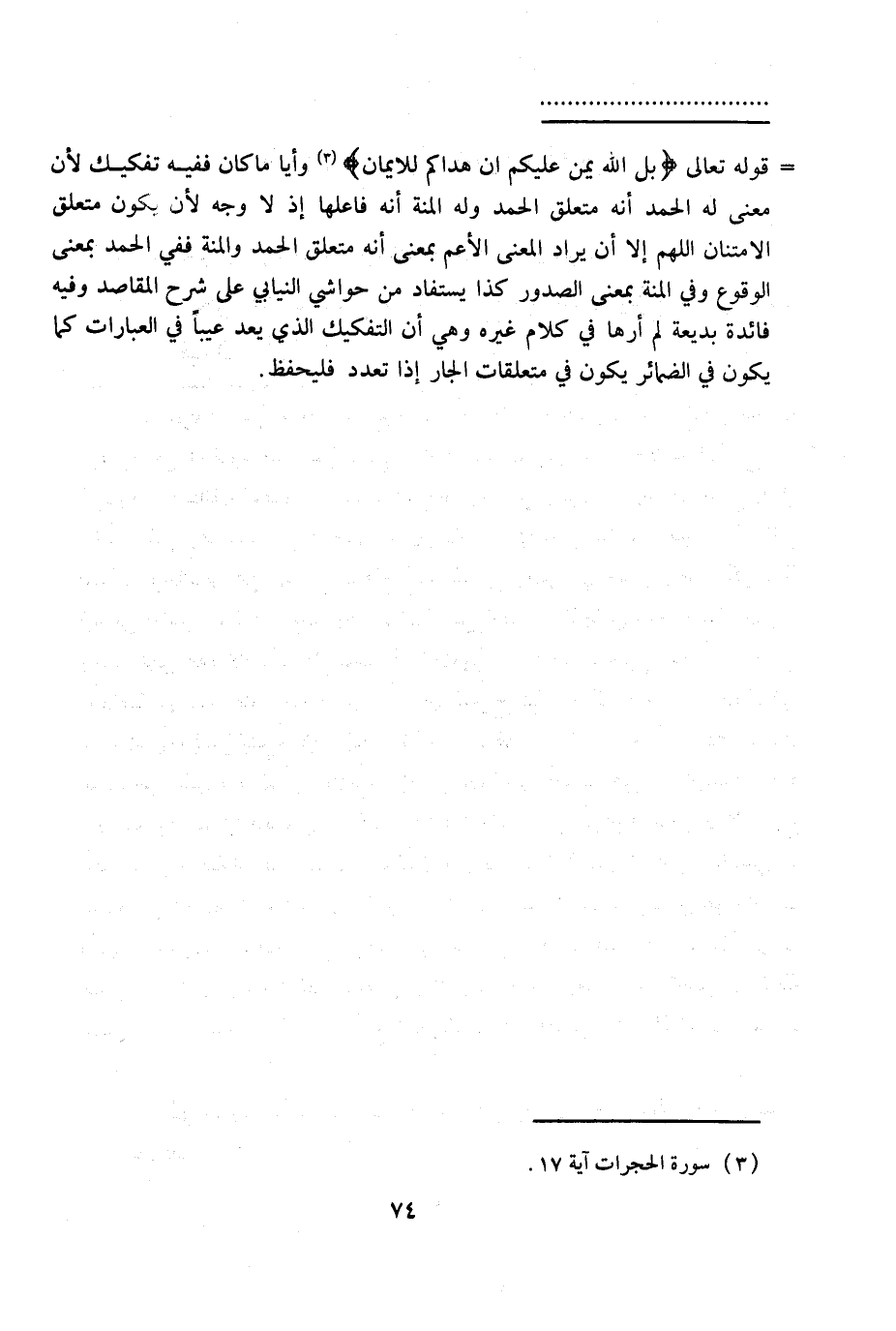 ـــــــــــــــــــــــــــــQقَوْله تَعَالَى {بَلِ اللَّهُ يَمُنُّ عَلَيْكُمْ أَنْ هَدَاكُمْ لِلإِيمَانِ} [الحجرات: 17] وَأَيًّا مَا كَانَ فَفِيهِ تَفْكِيكٌ؛ لِأَنَّ مَعْنَى لَهُ الْحَمْدُ أَنَّهُ مُتَعَلِّقُ الْحَمْدِ وَلَهُ الْمِنَّةُ أَنَّهُ فَاعِلُهَا إذْ لَا وَجْهَ لَأَنْ يَكُونَ مُتَعَلَّقَ الِامْتِنَانِ اللَّهُمَّ إلَّا أَنْ يُرَادَ الْمَعْنَى الْأَعَمَّ بِمَعْنَى أَنَّهُ مُتَعَلِّقُ الْحَمْدِ وَالْمِنَّةِ فَفِي الْحَمْدِ بِمَعْنَى الْوُقُوعِ وَفِي الْمِنَّةِ بِمَعْنَى الصُّدُورِ كَذَا يُسْتَفَادُ مِنْ حَوَاشِي السِّينَابِيِّ عَلَى شَرْحِ الْمَقَاصِدِ وَفِيهِ فَائِدَةٌ بَدِيعَةٌ لَمْ أَرَهَا فِي كَلَامِ غَيْرِهِ وَهِيَ أَنَّ التَّفْكِيكَ الَّذِي يُعَدُّ عَيْبًا فِي الْعِبَارَاتِ كَمَا يَكُونُ فِي الضَّمَائِرِ يَكُونُ فِي مُتَعَلِّقَاتِ الْجَارِ إذَا تَعَدَّدَ فَلْيُحْفَظْ.