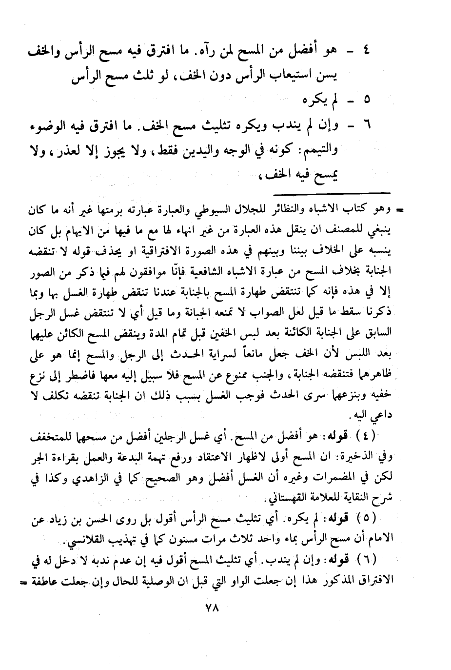 هُوَ أَفْضَلُ مِنْ الْمَسْحِ لِمَنْ رَآهُ. مَا افْتَرَقَ فِيهِ مَسْحُ الرَّأْسِ وَالْخُفِّ يُسَنُّ اسْتِيعَابُ الرَّأْسِ دُونَ الْخُفِّ، لَوْ ثُلْثُ مَسْحِ الرَّأْسِ.