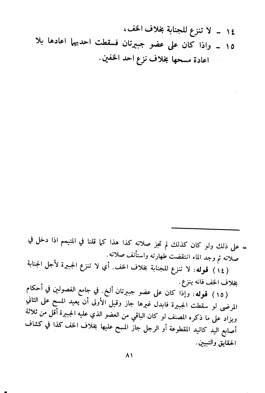 (14) قَوْلُهُ: لَا تُنْزَعُ لِلْجَنَابَةِ بِخِلَافِ الْخُفِّ. أَيْ: لَا تُنْزَعُ الْجَبِيرَةُ لِأَجْلِ الْجَنَابَةِ بِخِلَافِ الْخُفِّ فَإِنَّهُ يُنْزَعُ.