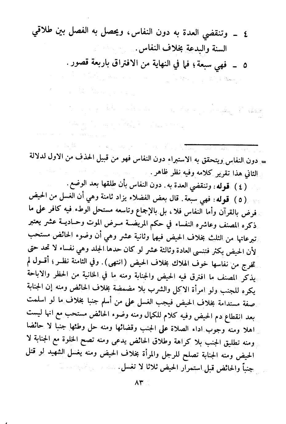 ـــــــــــــــــــــــــــــQدُونَ النِّفَاسِ وَيَتَحَقَّقُ بِهِ الِاسْتِبْرَاءُ دُونَ النِّفَاسِ فَهُوَ مِنْ قَبِيلِ الْحَذْفِ مِنْ الْأَوَّلِ لِدَلَالَةِ الثَّانِي هَذَا تَقْرِيرُ كَلَامِهِ وَفِيهِ نَظَرٌ ظَاهِرٌ.