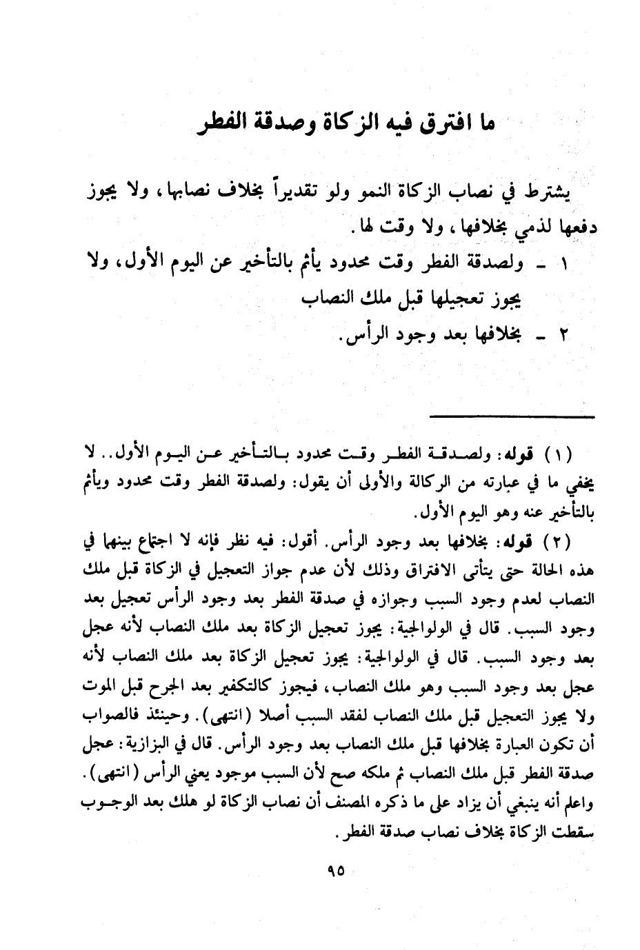 1 - وَلِصَدَقَةِ الْفِطْرِ وَقْتٌ مَحْدُودٌ يَأْثَمُ بِالتَّأْخِيرِ عَنْ الْيَوْمِ الْأَوَّلِ، وَلَا يَجُوزُ تَعْجِيلُهَا قَبْلَ مِلْكِ النِّصَابِ.