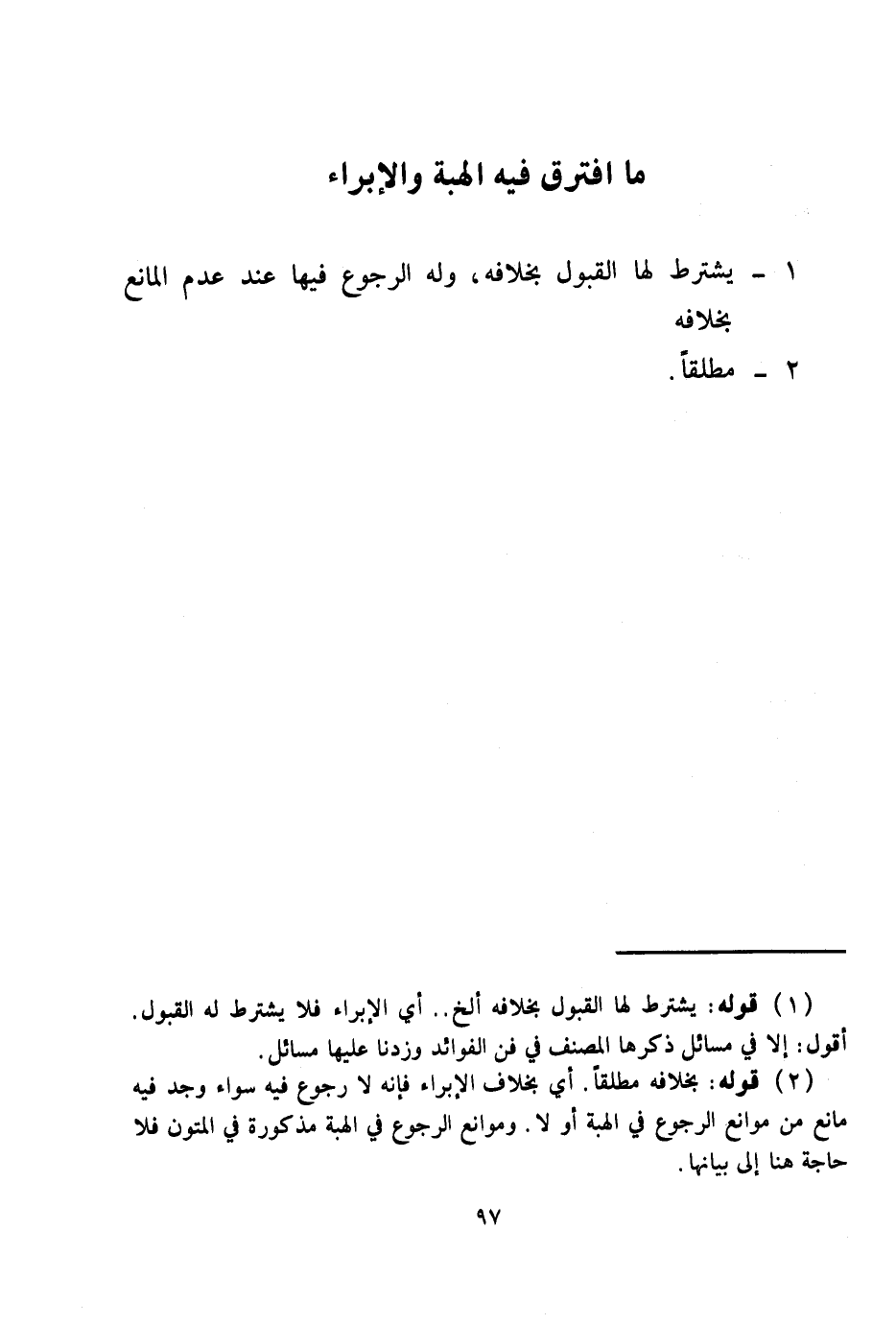 قَوْلُهُ: يُشْتَرَطُ لَهَا الْقَبُولُ بِخِلَافِهِ إلَخْ أَيْ الْإِبْرَاءُ فَلَا يُشْتَرَطُ لَهُ الْقَبُولُ. أَقُولُ: إلَّا فِي مَسَائِلَ ذَكَرَهَا الْمُصَنِّفُ فِي فَنِّ الْفَوَائِدِ وَزِدْنَا عَلَيْهَا مَسَائِلَ.