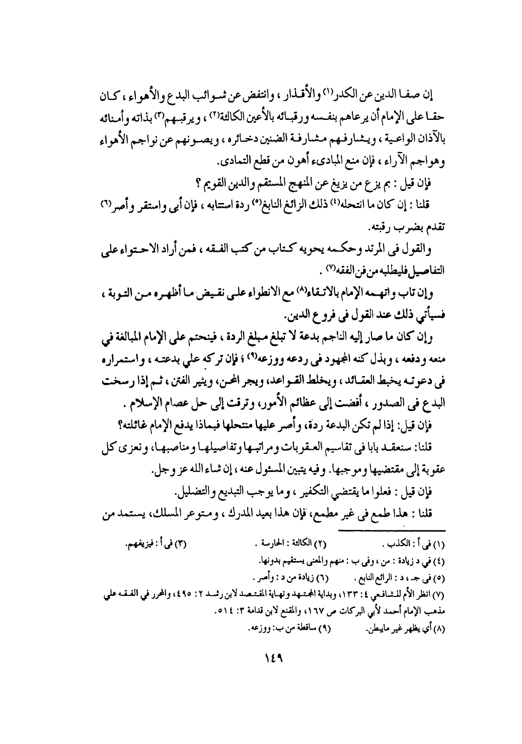 فأما ما يتعلق بأمر كلي فهو نقض بلاد الإسلام عن أهل العرامة والمتلصصين والمترصدين للرفاق فيجب على الإمام صرف الاهتمام إلى ذلك حتى تنتفض البلاد عن كل غائلة ويتمهد السبل للسابلة