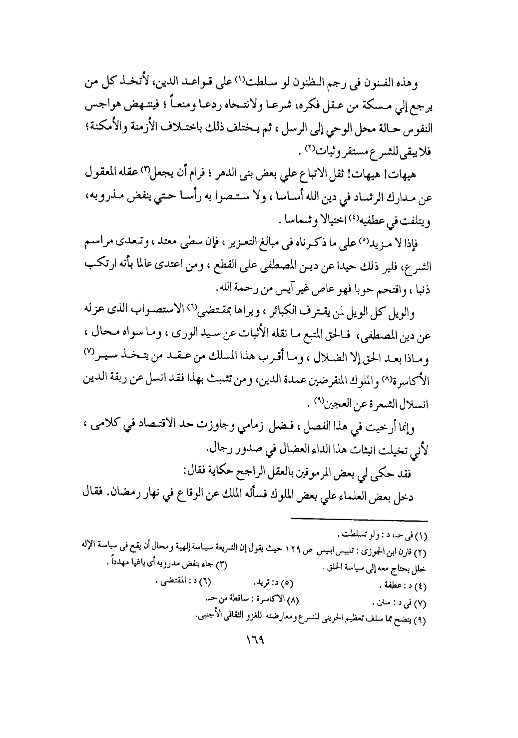 وقد كنت أحلت على هذا الفصل شيئا من أمور الدين وهذا أو أن الوفاء به فأقول إن نبغ في الناس داع في الضلالة وغلب على الظن أنه لا ينكف عن دعوته وشر غائلته فالوجه أن يمنعه وينهاه ويتوعده لو حاد عن ارتسام أمره وأباه فلعله يتزجر وعساه ثم يكل به موثوقا به حيث لا يشعر به ولا يراه فإن عاد إلى ما عنه نهاه بالغ في تعزيره وراعى حدا لشرع وتحراه ثم يثنى عليه الوعيد والتهديد ويبالغ في مراقبته من حيث لا يشعر ويرشح مجهولين يجلسون إليه على هيئات متفاوتات ويعتزون إلى مذهبه ويسترشدونه ويتدرجون إلى التعلم والتلقي منه فإن أبدى شيئا أطلعوا السلطان عليه فيتسارع إلى تأديبه والتنكيل به وإذا تكرر