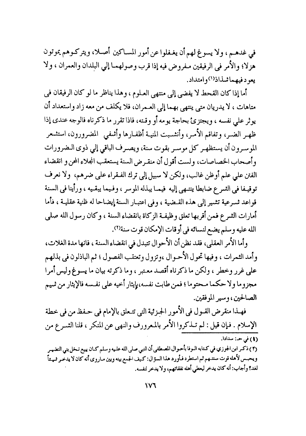 وأما الأمر العقلي فقد ظن أن الأحوال تتبدل في انقضاء السنة فإنها مدة الغلات وأمد الثمرات وفيها تحول الأحوال وتزول وتعتقب الفصول ثم الباذلون في بذلهم على غرر وخطر ولكن ما ذكرناه أقصد معتبر وما ذكرته بيان ما يسوغ وليس أمرا مجزوما ولا حكما محتوما فمن طابت نفسه بإيثار أخيه على نفسه فالإيثار من شيم الصالحين وسير الموفقين