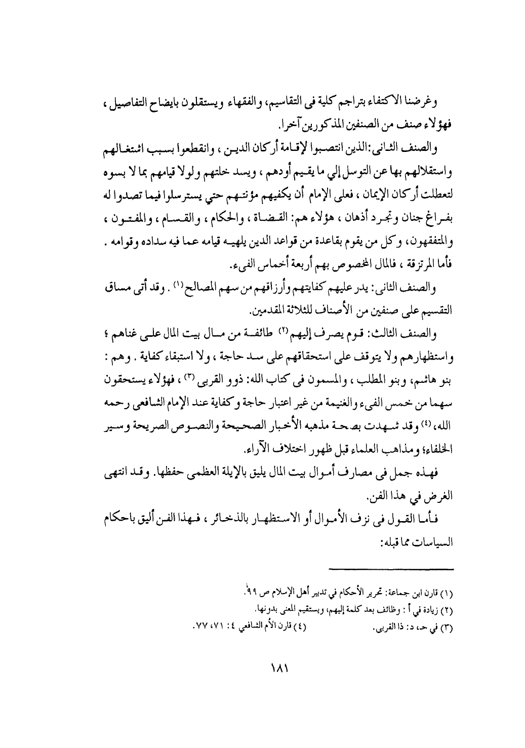 والصنف الثاني اقوام يبغي الأمام عليهم كفايتهم ويدرأ عنهم بالمال الموظف لهم حاجتهم ويتركهم مكفيين ليكونوا متجردين لما هم بصدده من مهم الإسلام وهؤلاء صنفان أحدهما المرتزقة وهم نجدة المسلمين وعدتهم ووزرهم وشوكتهم فينبغي أن يصرف اليهم ما يرم خلتهم