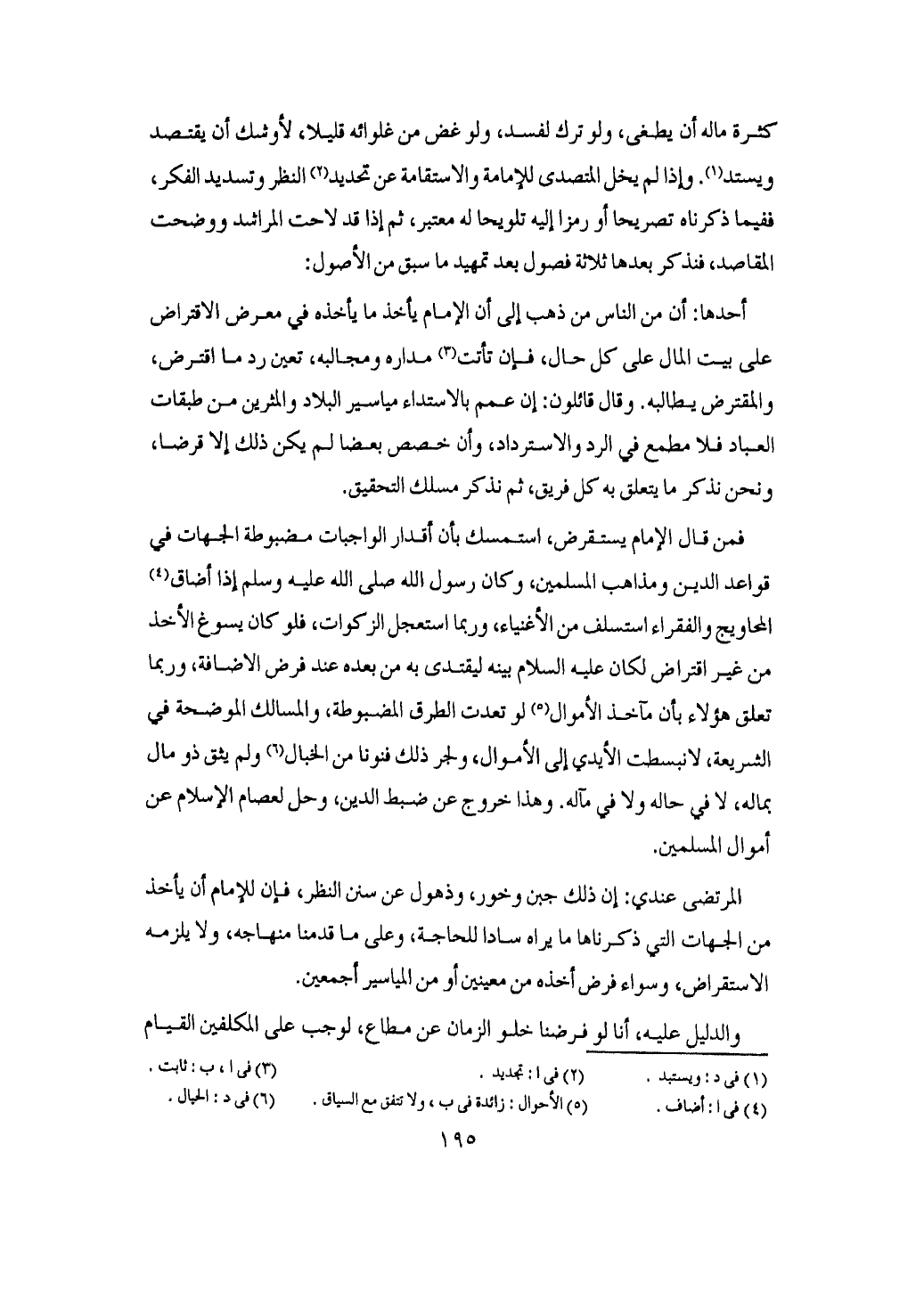 المنصوب في مال طفل مأمور بأن لا يقصر نظره على ضرورة حاله بل ينظر في حاله باستنماء ماله وطلب الاغبط فالاغبط في جميع امواله وليس أمر كلي الملة بأقل من أمر طفل ولا نظر الأمام القوام على خطة الإسلام بأقصر نظرا وفكرا من قيم وهذا واضح لاخفاء بمدركه عند انقطاع الجهاد