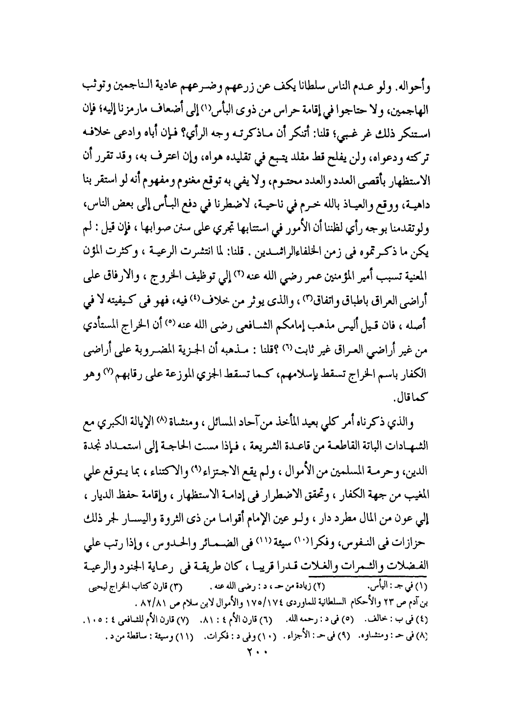 والأمر في أخذ الأموال يجري على هذه الاحوال فيشير على كل اغنياء في كل صقع بأن يبذلوا من المال ما يقع به الاستقلال وليس لتفاصيل الرأي غاية ونهاية فلير الأمام في ذلك كله رأيه وما ذكرناه ليس حصرا وضبطا في المقال ولكنا جئنا ضربا للأمثال وعلى رأي الأمام بعد عون الله الاتكال في مضطرب الاحوال
