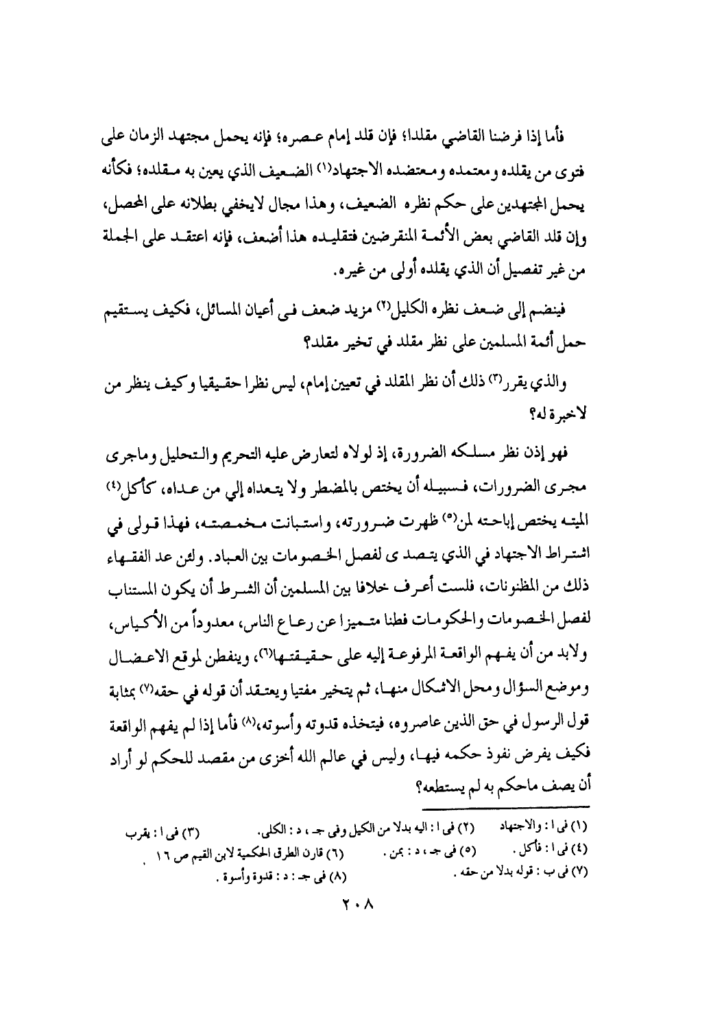 إلى المؤن القارة إلا بما يقتنصه القانصون من الصيود بالاضافة إلى النفقات الدائرة فلو ترك الناس المكاسب معولين على الاصطياد لهلكوا وضاعوا واضطربوا وجاعوا فهذه التشبيهات قدمتها لتوطئه أمر مقطوع به عندي قد يأباه المقلدون الذين لا تقتضيهم نفوسهم التحويم على الحقائق فضلا عن ورودها وكلما ظهرت حقيقة ولاحت إلى دركها طريقة ضروا بجحودها فأقول والله المستعان لا بد من توظيف أموال يراها الأمام قائمة بالمؤن الرابتة أو مدانية لها وإذا وظف الأمام على الغلات والثمرات أو ضروب الزوائد والفوائد من الجهات يسرا من كثير سهل احتماله ووقى به اهب الإسلام وماله واستظهر رجاله وانتظمت قوماعد الملك واحواله ولو عدم الناس سلطانا يكف عن زرعهم وضرعهم عادية الناجمين وتوثب الهاجمين لاحتاجوا في اقامة حراس من ذوي البأس إلى اضعاف ما رمزنما اليه فان استنكر ذلك غر غبي قلنا اتنكر أن ماذكرته وجه الرأي فإن أباه وادعى خلافه تركته ودعواه ولن يفلح قط مقلد يتبع في تقليده هواه وان اعترف به وقد تقرر أن الاستظهار بأقصى العدد والعدد محتوم ولا يفي به توقع مغنوم ومفهوم انه لو استقر بنا داهية ووقع والعياذ بالله خرم في ناحية لاضطرنا في دفع البأس إلى بعض الناس لو تقدمنا بوجه رأي لظننا أن الأمور في
