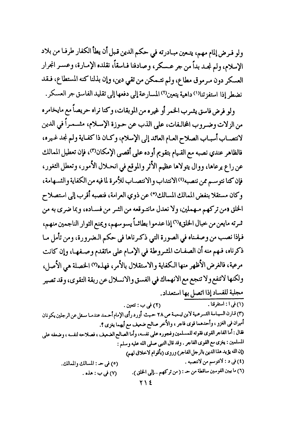 ليس من الممكن أن يتعاطى الأمام مهمات المسلمين في الخطة وقد اتسعت اكنافها وانتشرت اطرافها ولا يجد بدا من أن يستنيب في احكامها ويستخلف في نقضها أو في ابرامها واحكامها وشغله الذي لا يخلفه فيه أحد مطالعات كليات الأمور إذ لو وكل ذلك إلى غيره وعمد على أن لا يبحث ولا يخبر ولا يفحص ولا ينفر وفوض ذلك إلى موثوق به ورسم له التشمير والبحث و التنقير وآثر التخلص لعبادة الله والانحجاز عن النظر في أمر الملة واختار الرفاهية والرغد والدعة والدد فذلك غير سائغ وهو مؤاخذ بحق الأمة يوم القيامة مطالب أو معاتب معاقب وإذا تمادى على ذلك فقد ينتهي الأمر إلى التفسيق وقد سبق القول فيه على التحقيق فإن اراد أن يخلع نفسه فقد تقدم فيه قول بالغ وبيان شاف سائغ فإذا منصب الأمام يقتضي القيام بالنظر العام في حقوق الرعايا والمستخلفين عليهم على ممر الايام فأما تفاصيل الأمور فما تولاه الأمام بنفسه فهو الأصل وما استخلف فيه كافيا مستقلا داريا متيقظا فيما نيط به واعيا فالاستخلاف في تفاصيل الاعمال سائغ بلا خلاف ثم ما يستخلف فيه ينقسم إلى أمر خاص يحتوي على الغرض منه مراسم يبينها ومعالم يعنيها