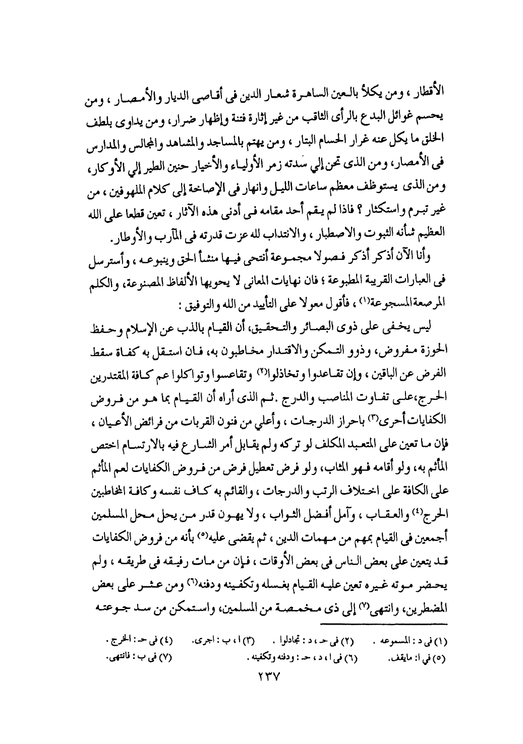 أن قصر العاقدون وأخروا تقديم امام وطالت الفترة وتمادت العسرة وانتشرت اطراف المملكة وظهرت دواعي الخلل فتقدم صالح للامامة داعيا إلى نفسه محاولا ضم النشر ورد ما ظهر من دواعي الغرر فإذا استظهر بالعدة التامة من وصفناه فظهوره هذا لا يحمل على الفسوق والعصيان والمروق فإذا جرى ذلك وكان يجر صرفه ونصب غيره فتنا وأمورا محذورة فالوجه أن يوافق ويلقي اليه السلم وتصفق له ايدي العاقدين وهل تثبت له الامامة بنفس الاستظهار والانتداب للامر ما أراه انه لا بد من اختيار وعقد فإنه ليس متوحدا فيقضي بتعين الامامة له وثبوت الامامة من غير تولية عهد نم امام أو صدور بيعة ممن هو من أهل العقد أو استحقاق بحكم التفرد والتوحد كما سبق بعيد