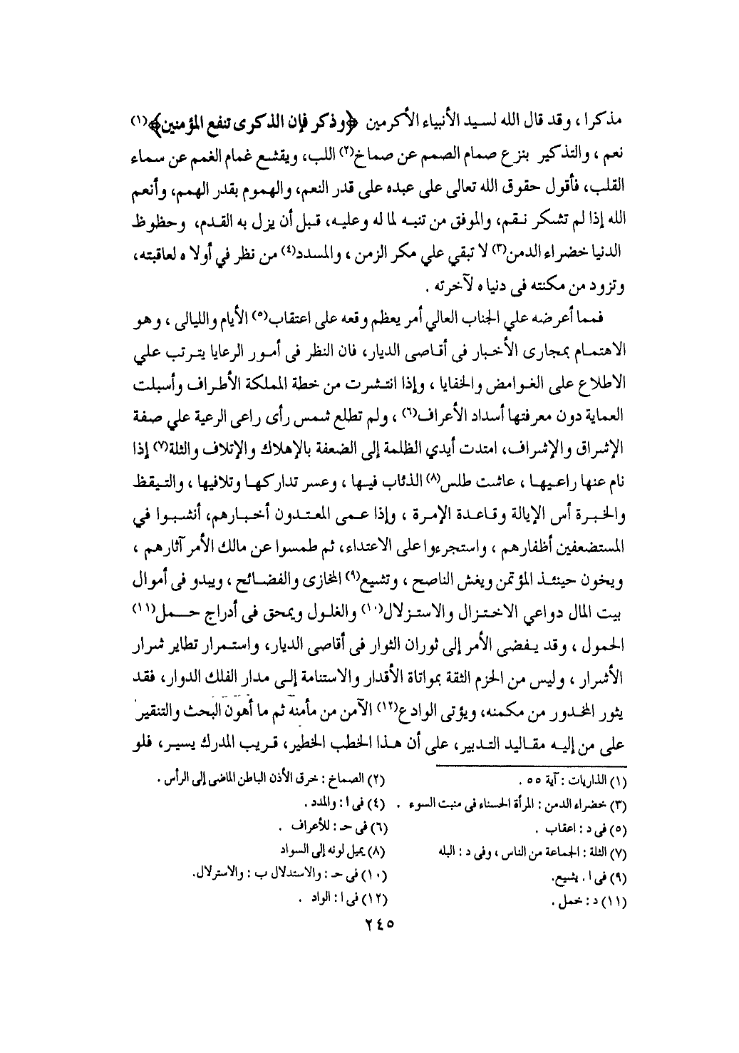 استقل فرد الزمان بعدة لا تصادم واستطالت يده الطولي على الممالك عرضا وطولا واستتبت الطاعة امكنت الاستطاعة فقيامه بمصالح أهل الإيمان بالسيف والسنان كقيام الواحد من أهل الزمان بالموعظة الحسنة باللسان وها أنا الآن انهي القول فيه إلى قصاري البيان والله تعالى المستعان
