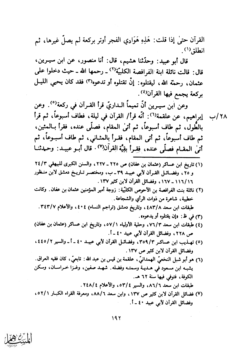 وعن إبراهيم، عن علقمة: أنَه قرأ القرآن في ليلة، فطاف أسبوعاً، ثم قرأ