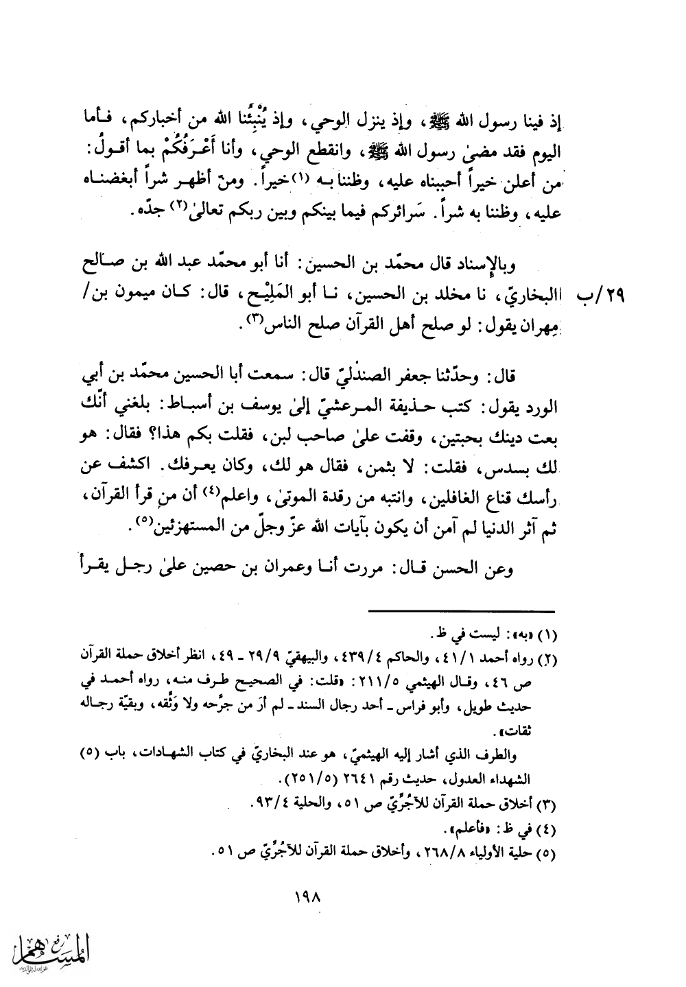 وعن الحسن قال: مررت أنا وعمران بن حصين على رجل يقرأ