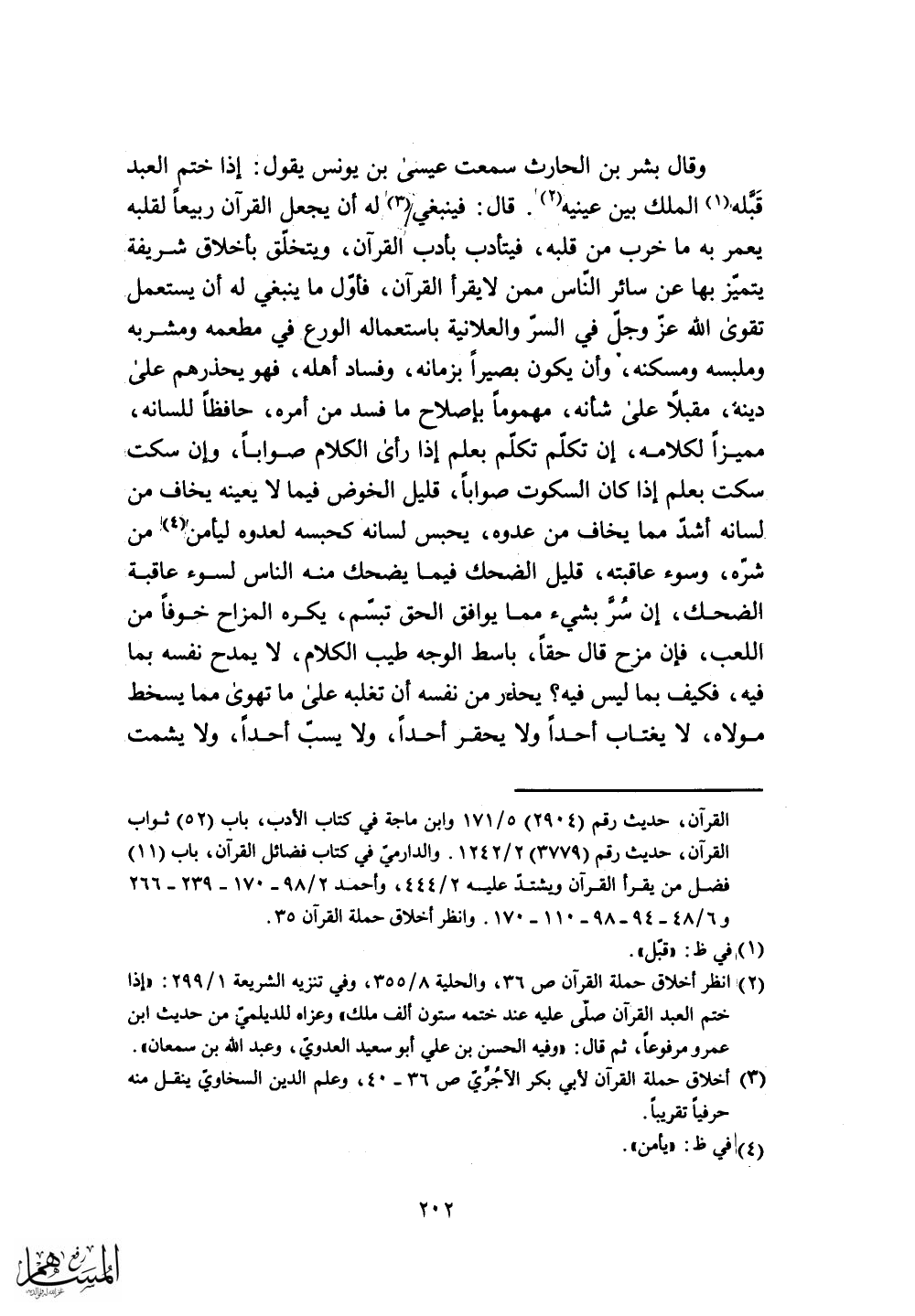 وقال بشر بن الحارث سمعت عيسى بن يونس يقول: إذا ختم العبد