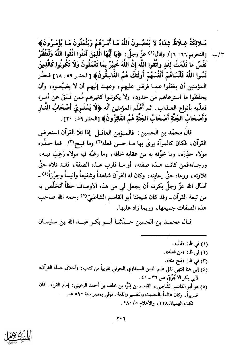 قال محمد بن الحسين: فالمؤمن العاقل إذا تلا القرآن استعرض