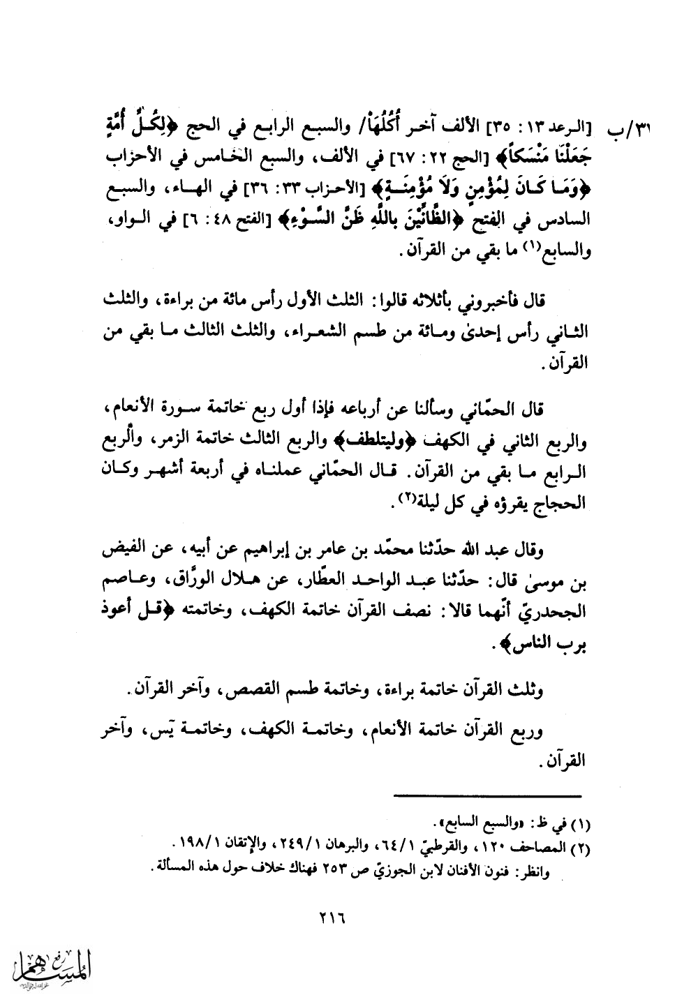 وربع القرآن خاتمة الأنعام، وخاتمة الكهف، وخاتمة يس، وآخر