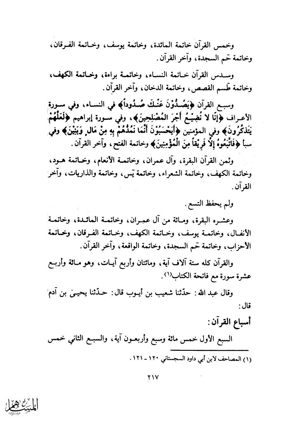 وسدس القرآن خاتمة النساء، وخاتمة براءة، وخاتمة الكهف.