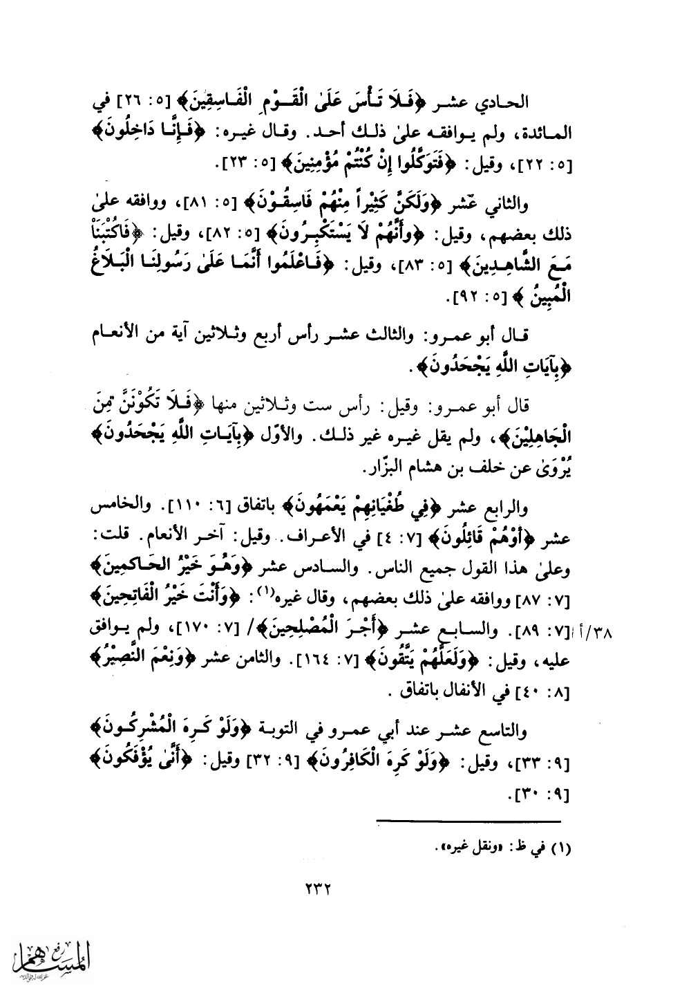 قال أبو عمرو: وقيل: رأس ست وثلاثين منها (فَلَا تَكُونَنَّ مِنَ الْجَاهِلِينَ) ، ولم يقل غيره غير ذلك.